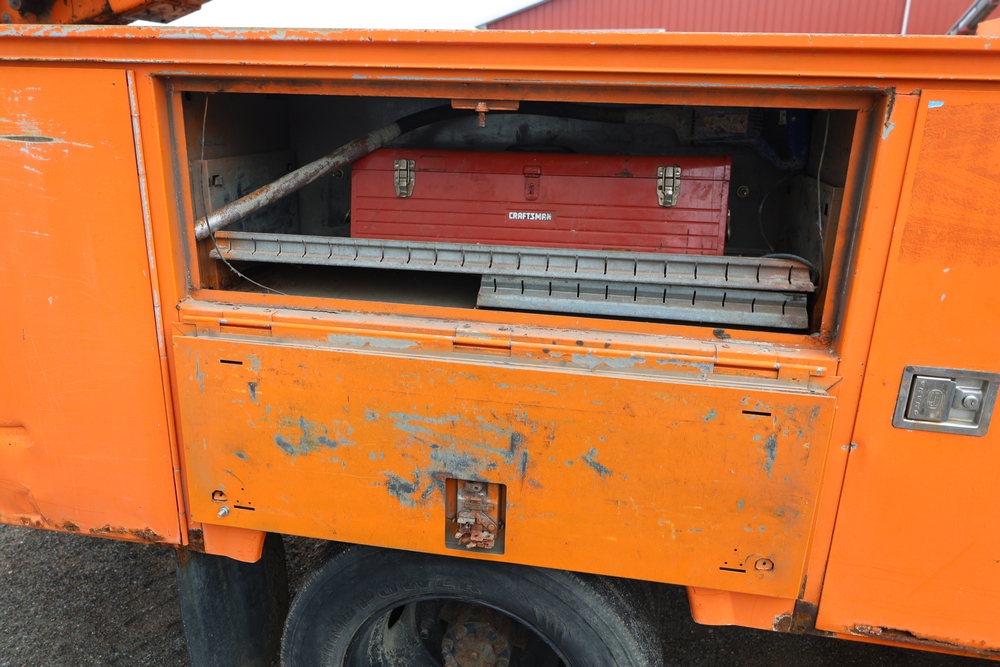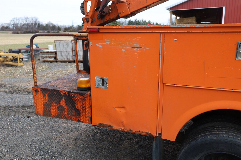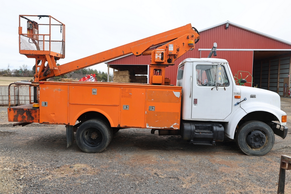 1998 International 4700 with a 7.3L V8 diesel engine. VIN: 1HTSCABK2WH529757. Odometer reading: 38209. Hour meter reading: 2048. Body: utility service truck with aerial boom. Equipped with Aero-Lift 2TPE-35 boom, 35 ft platform height, 500 lb capacity, dual rear wheels, side storage compartments, rear hitch, strobe light, and in-cab boom controls.