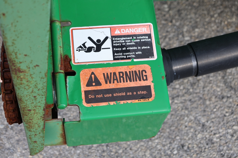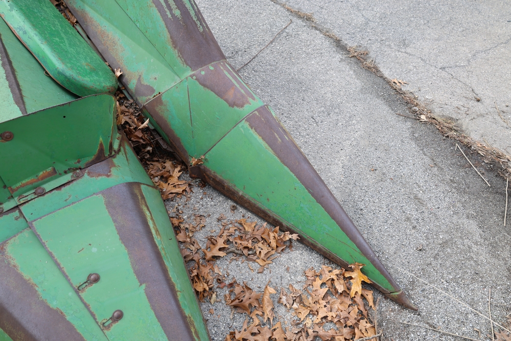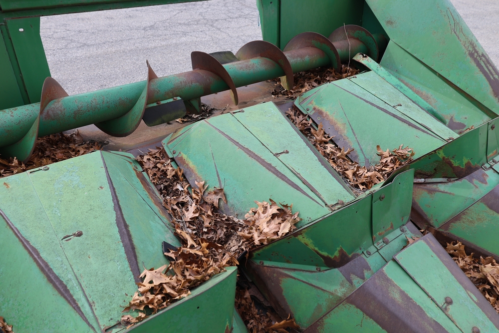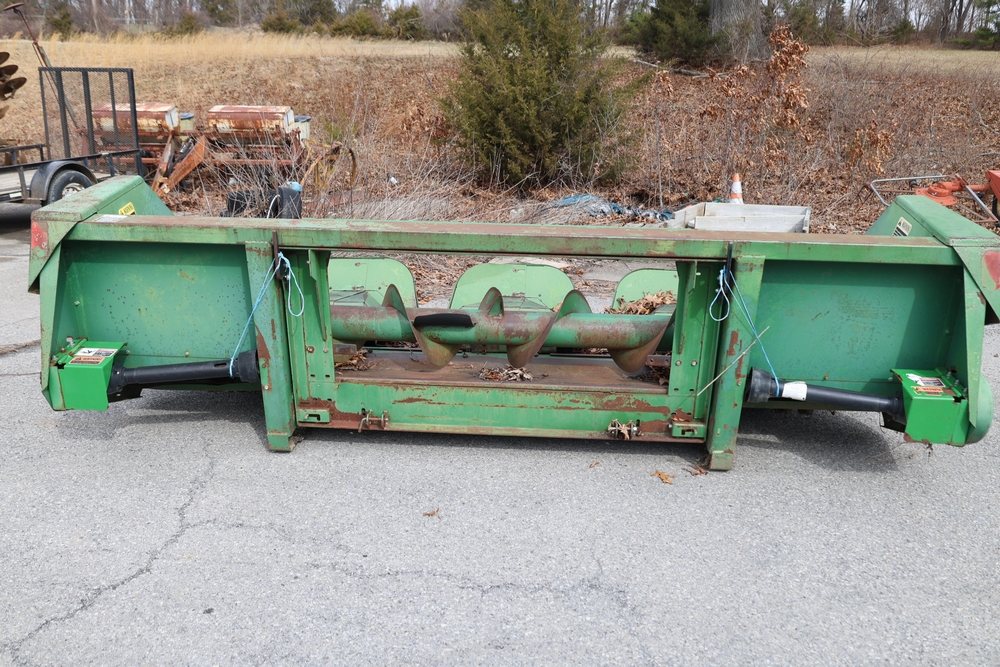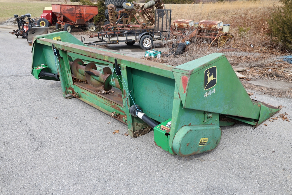 John Deere 444 corn head with four row configuration, gathering chains, snapping rolls, and PTO drive shafts.