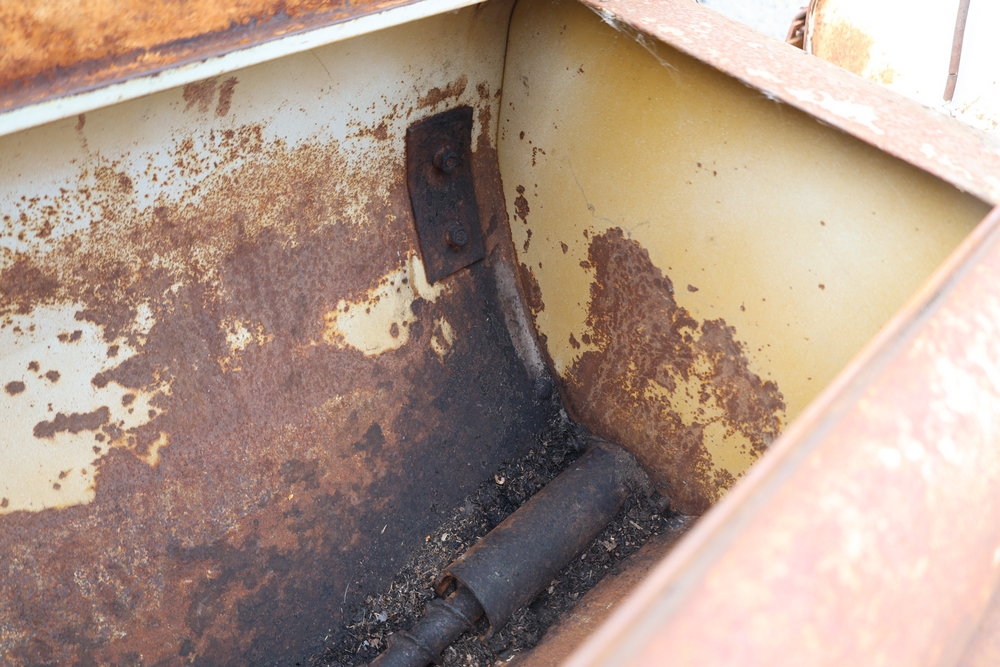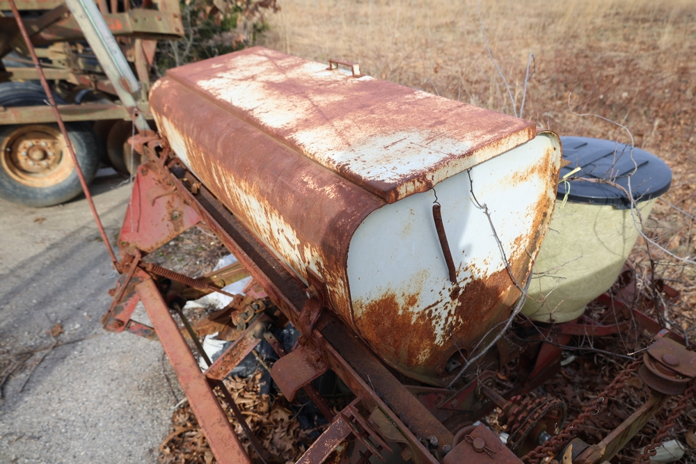 International Harvester 4-row plate planter with fiberglass seed hoppers and fertilizer boxes.