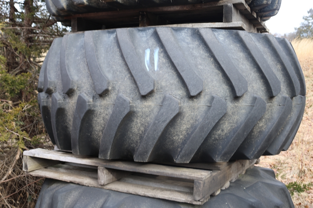 Set of large agricultural tractor tires from a Case 2366 combine. 30.5 x 32 x 12 ply tires, two mounted on rims.