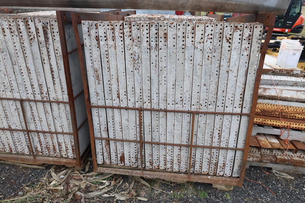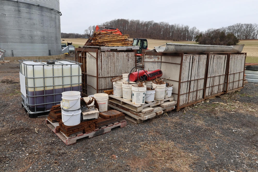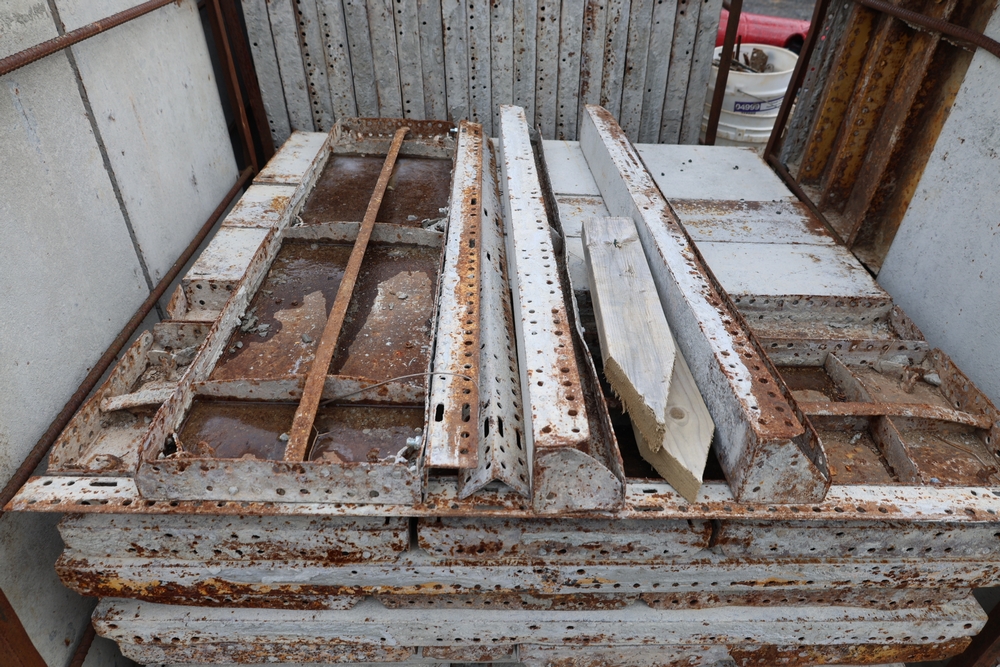 Concrete form supplies including IBC tote tank with metal cage and plastic pallet base containing liquid, includes multiple pallets of steel concrete forms and hardware, assorted metal brackets, buckets with fasteners, and two red portable heaters.