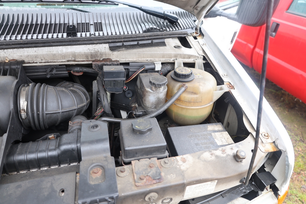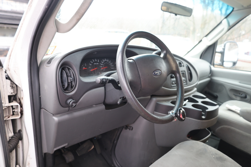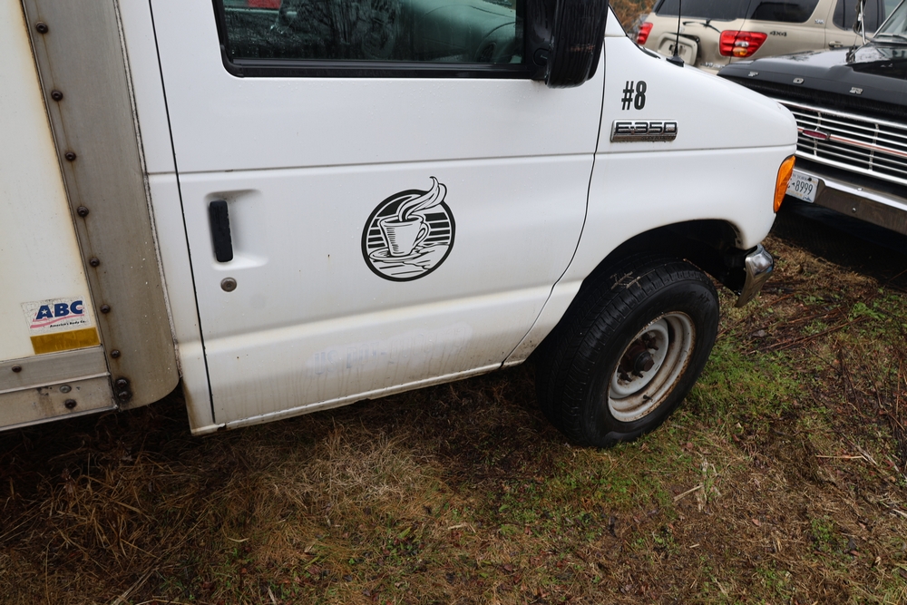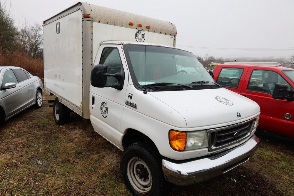 2007 Ford E-Series Van E-350 Super Duty with a 5.4L V8 SOHC 16V engine. VIN: 1FDSE35L97DB03043. Odometer reading: 170479. Body: cutaway. Box truck body with rear swing doors, interior shelving, cab partition, side mirrors, front grille, front bumper, steel wheels. NY Dealer transfer paperwork. Runs and drives. Key available.