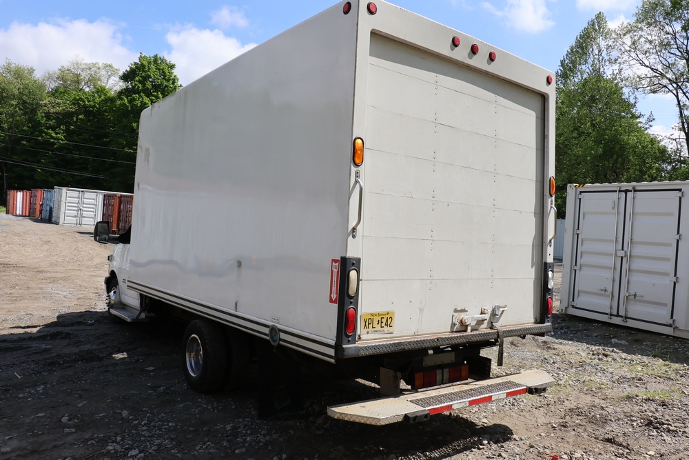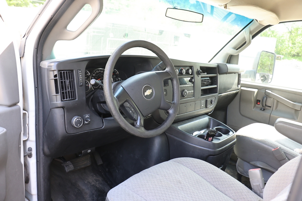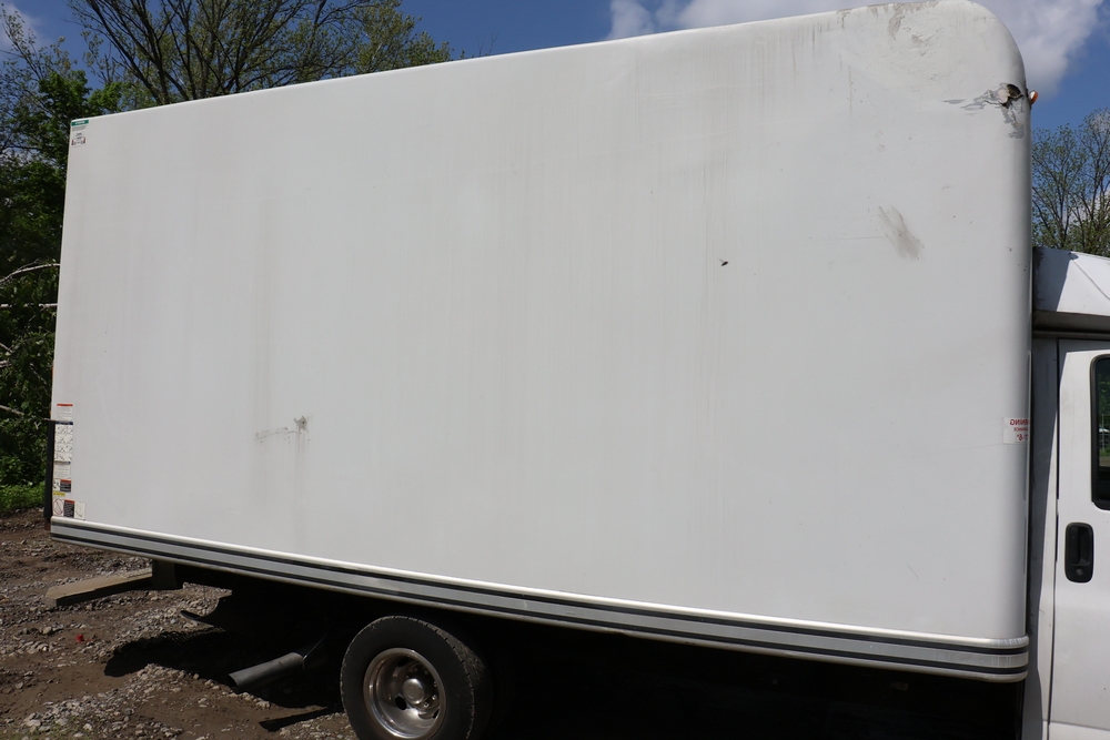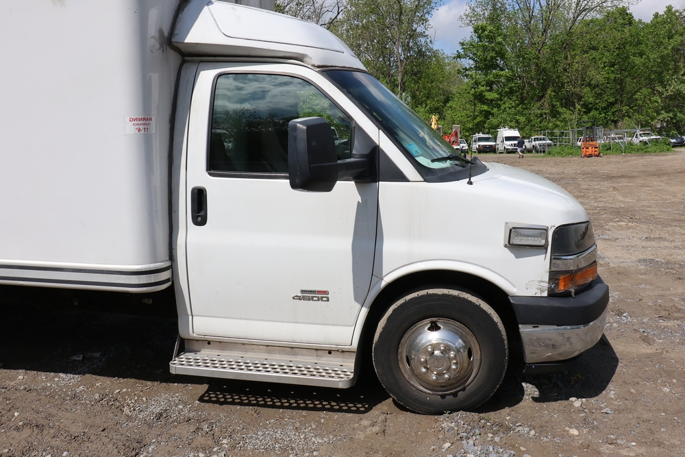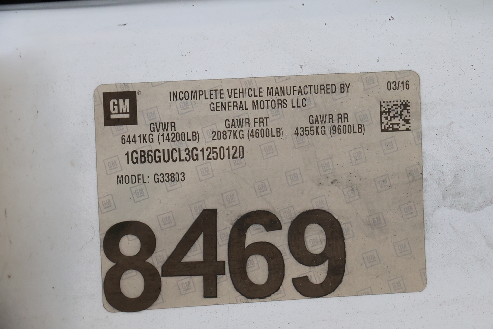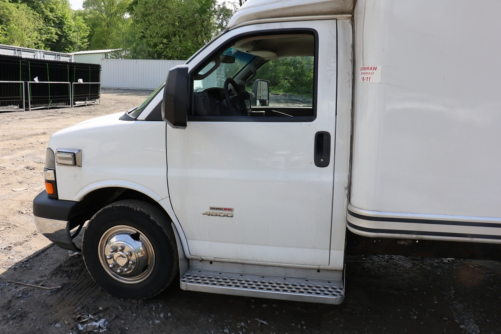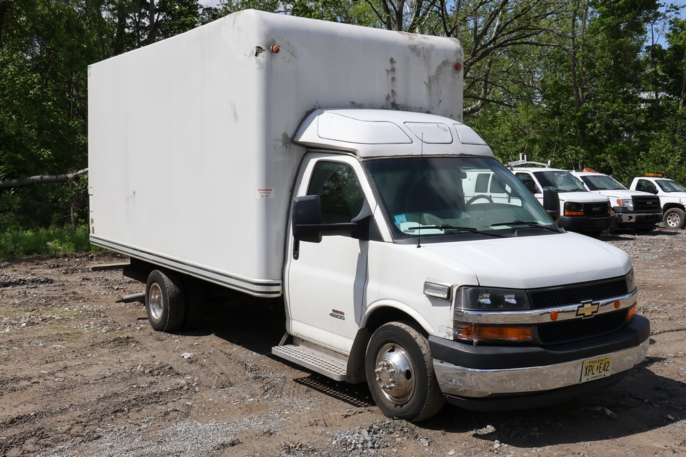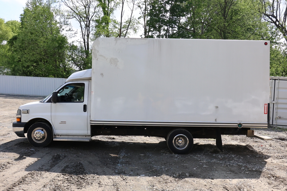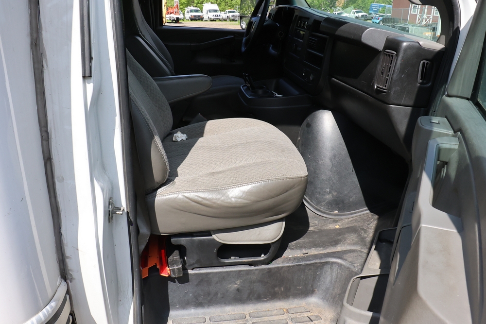2016 Chevrolet Express G33803 box truck. VIN: 1GB6GUCL3G1250120. Odometer reading: 196,184 miles. Engine: 6.6L V8 OHV 16V Turbo diesel. Transmission: Automatic. Exterior: White cab and box body with dual rear wheels, rear roll-up door, and step bumper. Interior: Gray cloth seating with power outlets, manual climate controls, and factory AM/FM stereo system. Runs and drives. Keys, Title & Bill of Sale Available. Mileage will vary at the time of pickup.