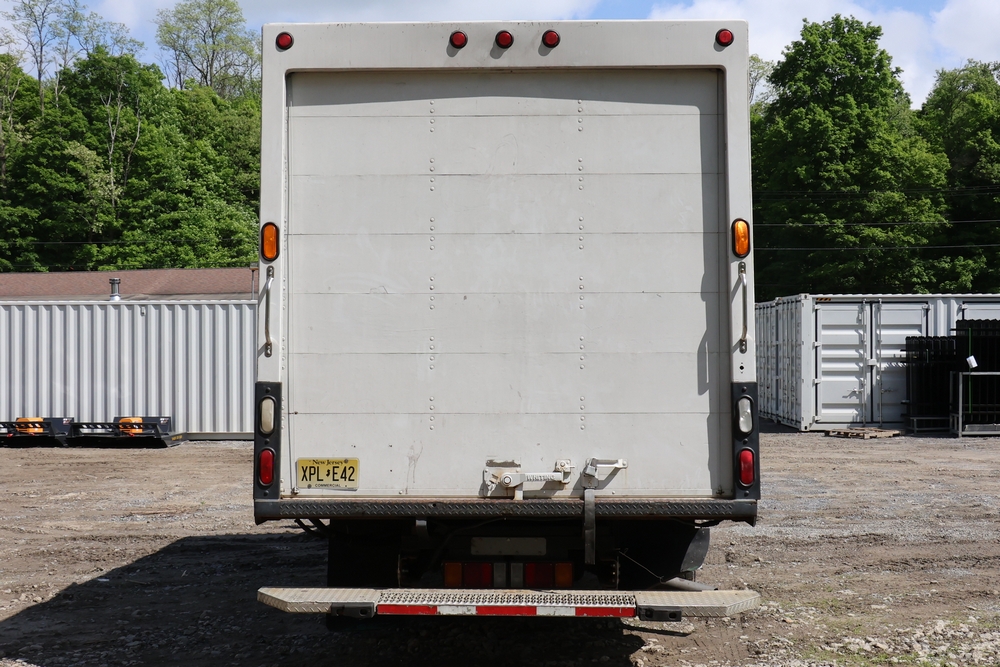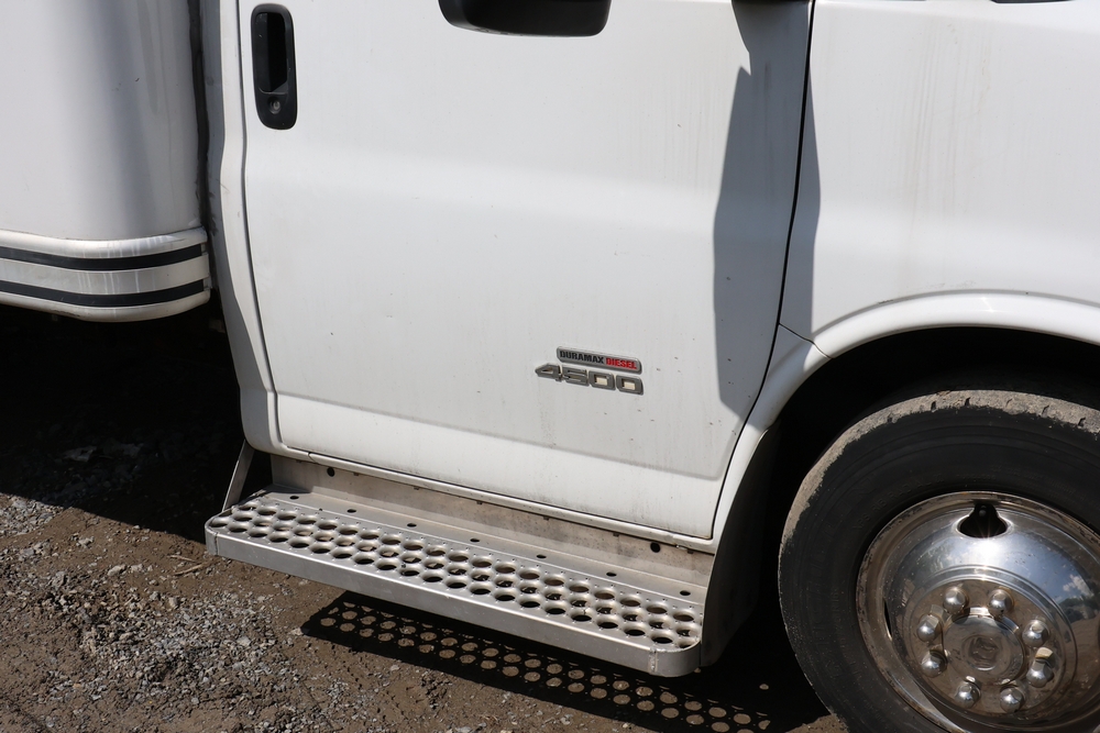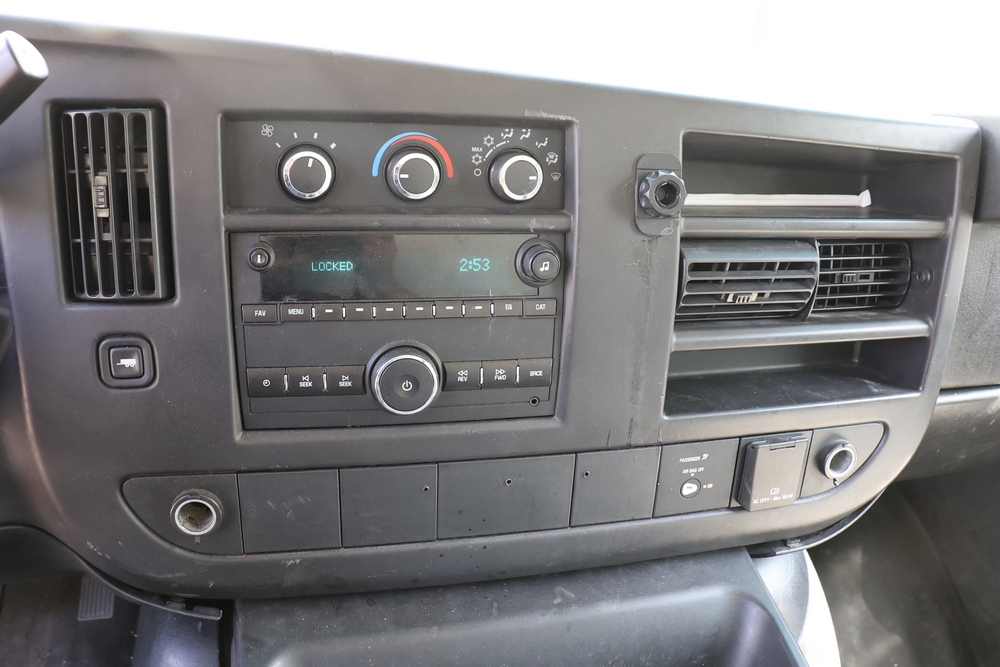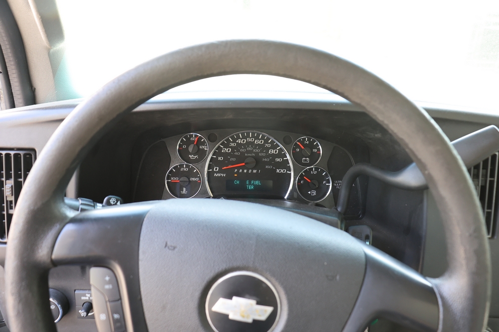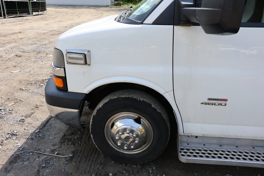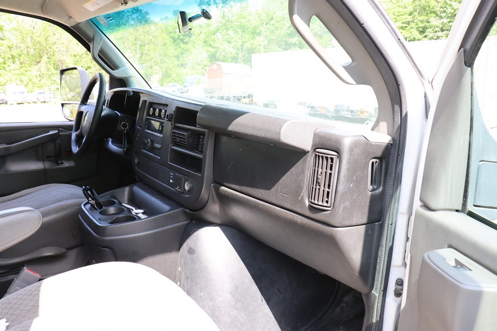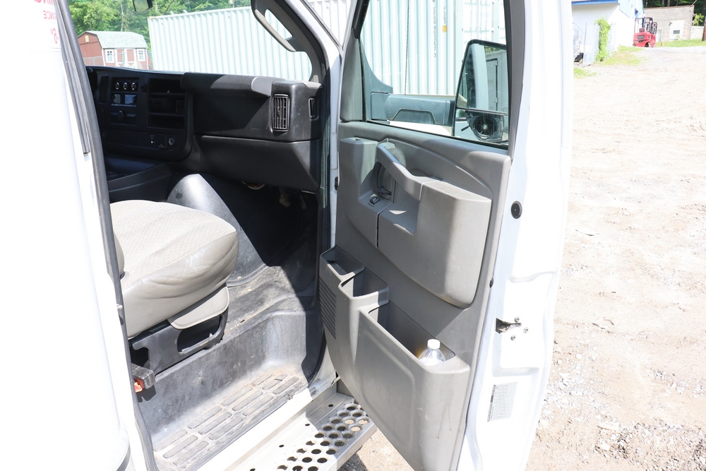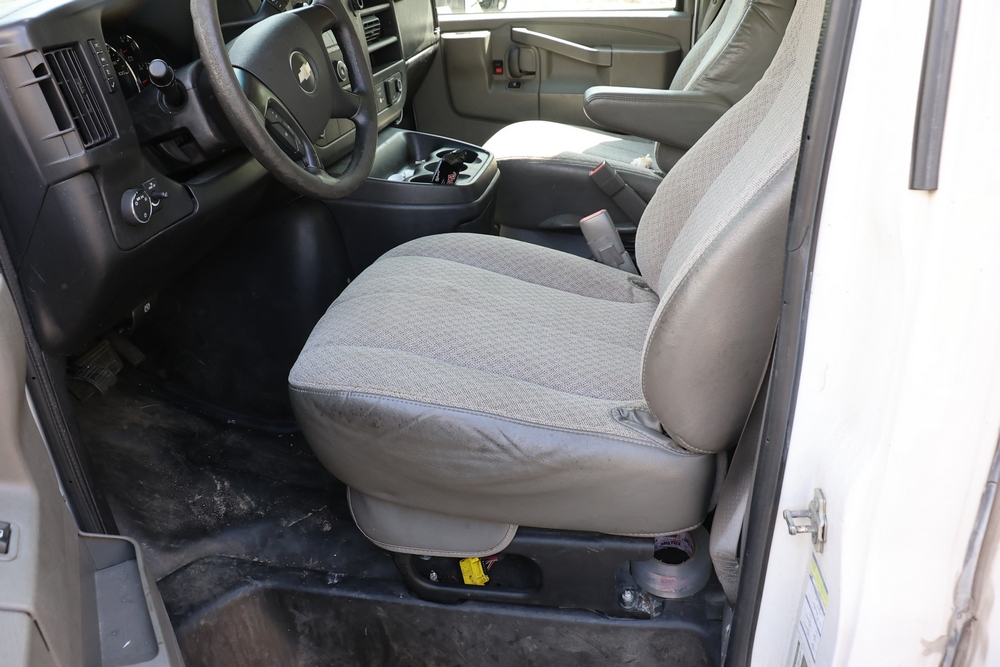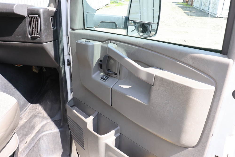 2016 Chevrolet Express G33803 box truck. VIN: 1GB6GUCL3G1250120. Odometer reading: 196,184 miles. Engine: 6.6L V8 OHV 16V Turbo diesel. Transmission: Automatic. Exterior: White cab and box body with dual rear wheels, rear roll-up door, and step bumper. Interior: Gray cloth seating with power outlets, manual climate controls, and factory AM/FM stereo system. Runs and drives. Keys, Title & Bill of Sale Available. Mileage will vary at the time of pickup.