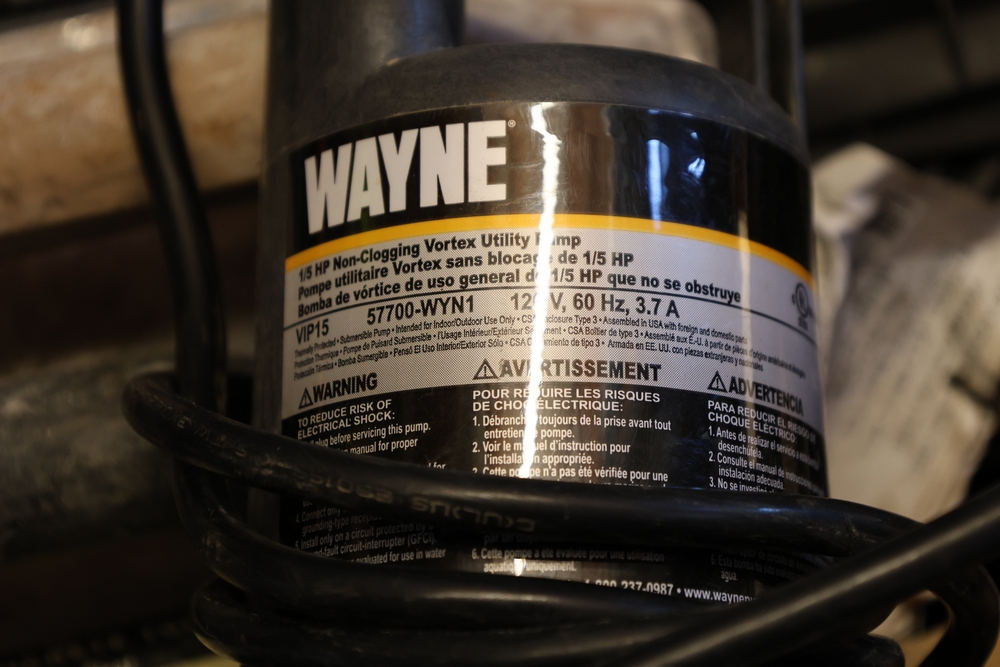 Assorted tools and shop items including Genie components, Wayne WaterBUG submersible pump, Wayne 1/5 HP utility pump, Makita BO5030 sander, Allegro knee/elbow pads, extension cords, toolboxes, levels, cooler, and floor mats.