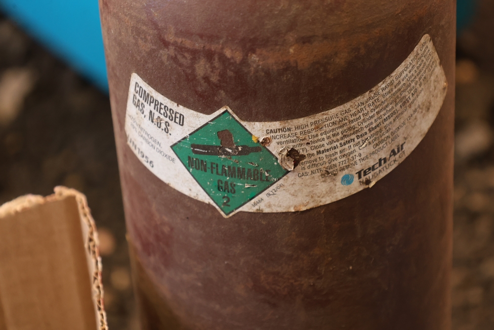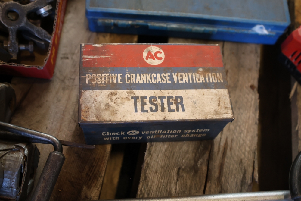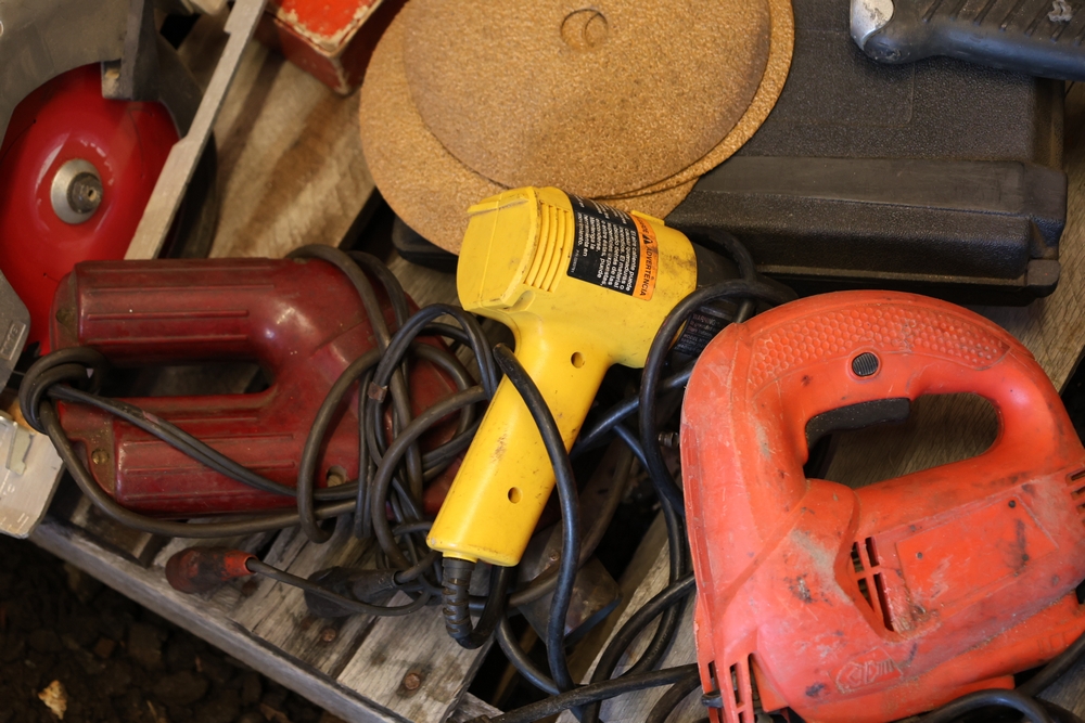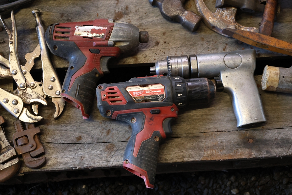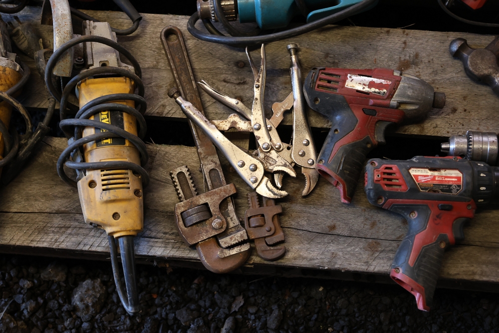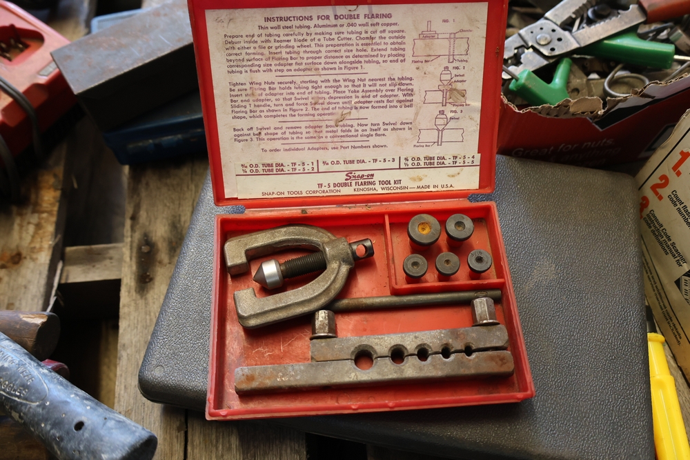 Assorted tools and shop items including DeWalt angle grinders, circular saw, reciprocating saw, drills, pipe threading set, Snap-on double flaring tool kit, micrometer set, AC 6500 tester, Spectrum mobile antenna components, hardware, and compressed gas cylinder.