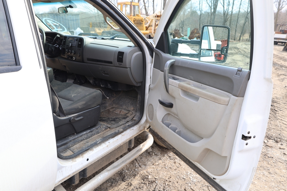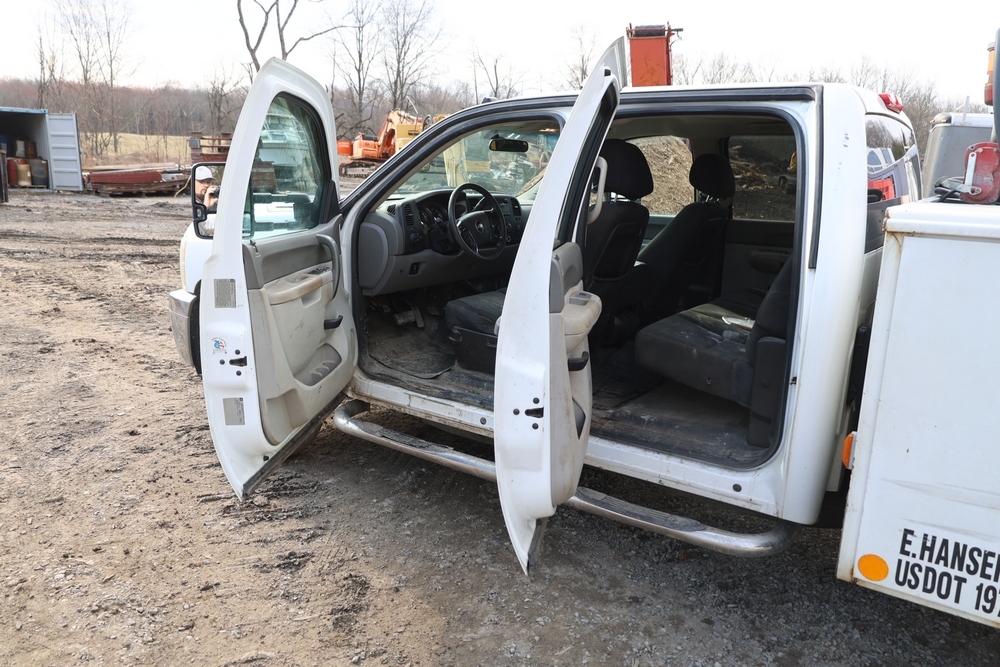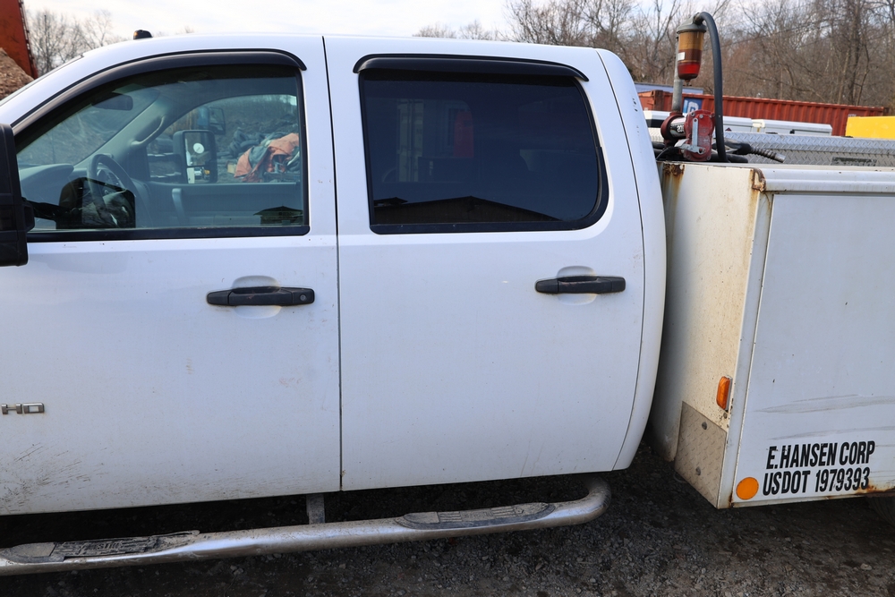 2012 Chevrolet Silverado 3500HD Work Truck Crew Cab 2WD service truck with a 6.6L V8 OHV 32V TURBO DIESEL engine. VIN: 1GB4CZCL1CF172191. Odometer reading: 276690. Body: crew cab pickup 4-dr. RWD, 6-speed automatic transmission, locking differential, utility body, dual rear wheels, running boards, tow hooks, 100 gallon fuel transfer tank with pump and nozzle, diamond plate crossover toolbox, beacon light, steel wheels, tow hitch receiver, air conditioning, cruise control, tilt steering, AM/FM radio, power door locks. Runs and drives. Title and key available.