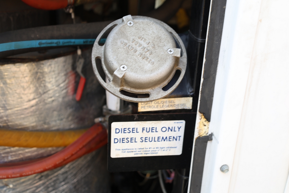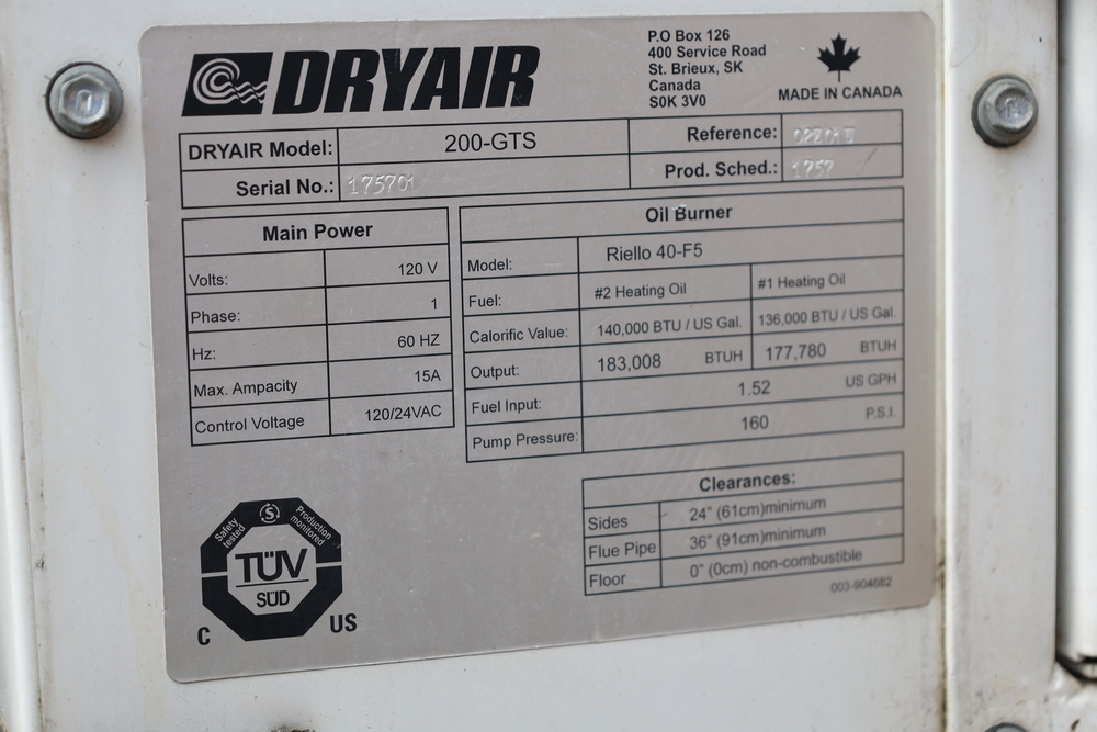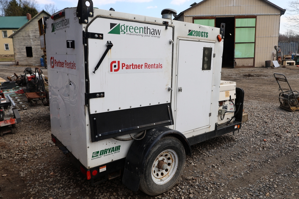 DryAir Greenthaw heat thaw unit, model 200-GTS, serial number 175701, date of manufacture January 2019, trailer mounted, VIN 2DRUS4163KS175701, GVWR 2721 kg (6000 lb.), single axle, equipped with Hannay hose reel model EP 6032-39-40-15.5 RT (serial 2712304), includes MultiQuip WhisperWatt diesel powered AC generator model DAC-7000SSA (serial 5764853), 6000 W, 120/240 V, 25 A, 60 Hz, single phase, Kubota diesel engine model Z482, hour meter reading 2368.1 hours on generator and 3961.4 hours on heat unit. Includes dual zones, 600 feet of hose per zone, reverse flow, will run on generator or outlet, produces up to 180 degree water, hot water heater fan blower heater and 100 gallon fuel capacity. Seller reports: Operational.
