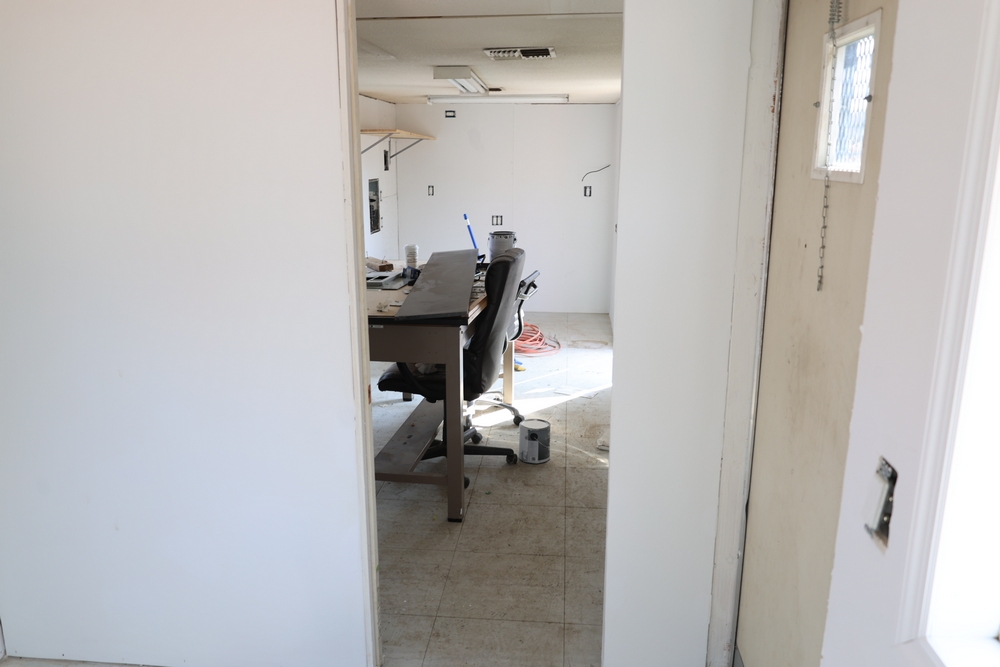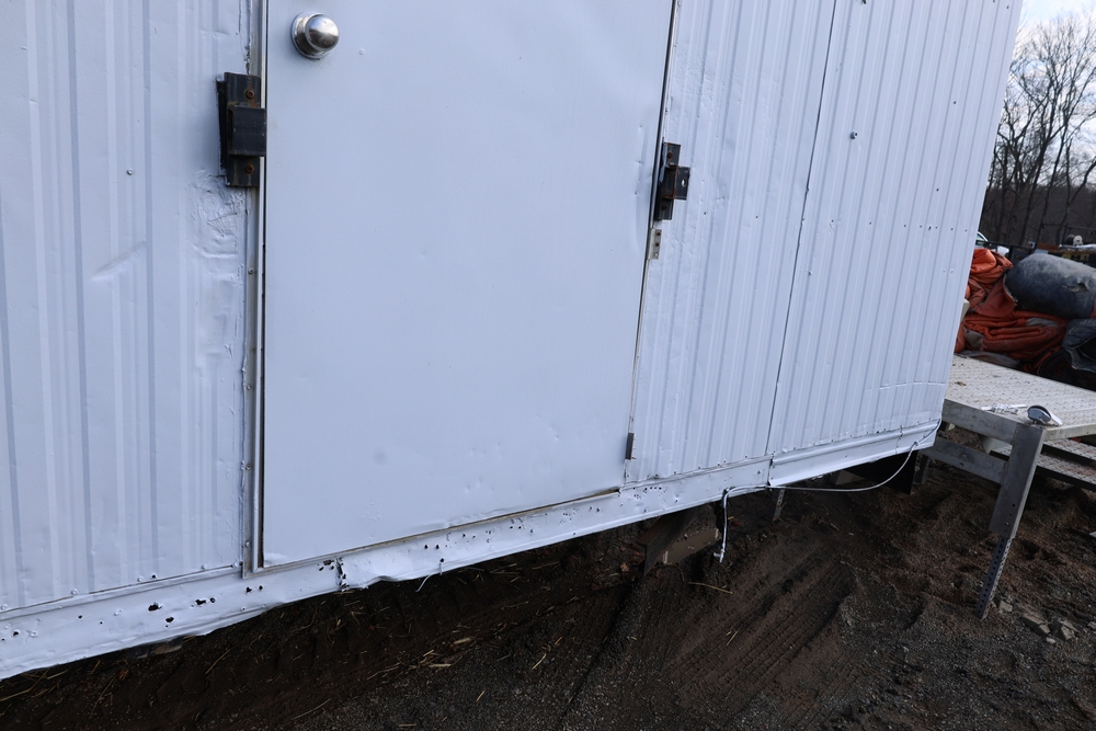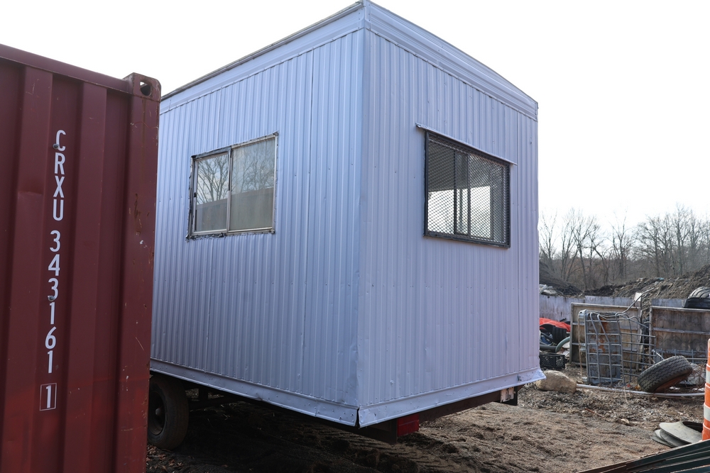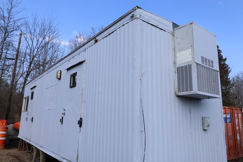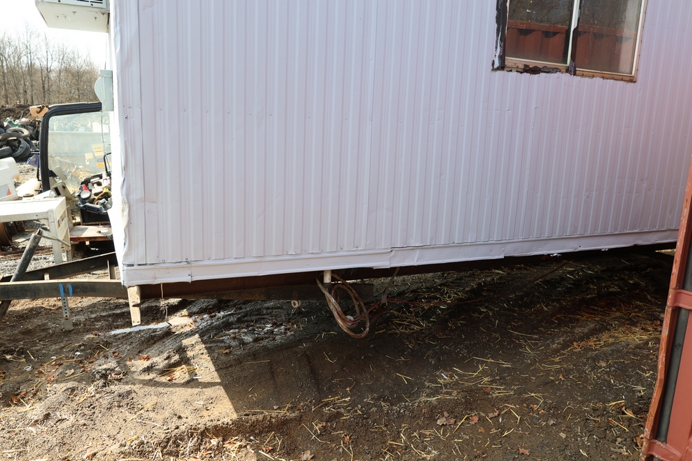 Mobile office trailer. White exterior. Tandem axle. Two entry doors. Multiple windows with exterior security bars. Wall-mounted air conditioning unit. Interior includes fluorescent lighting, electrical panel, outlets, and wall-mounted shelving. Includes metal entry steps/platform. Bill of sale only.