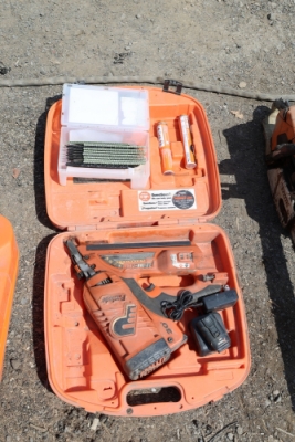Paslode CFN325XP 30 degree framing nailer with case, charger, battery, fuel cell, and nails.