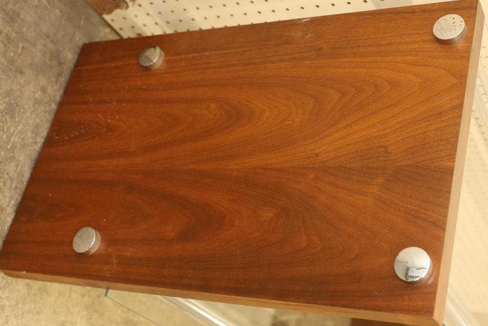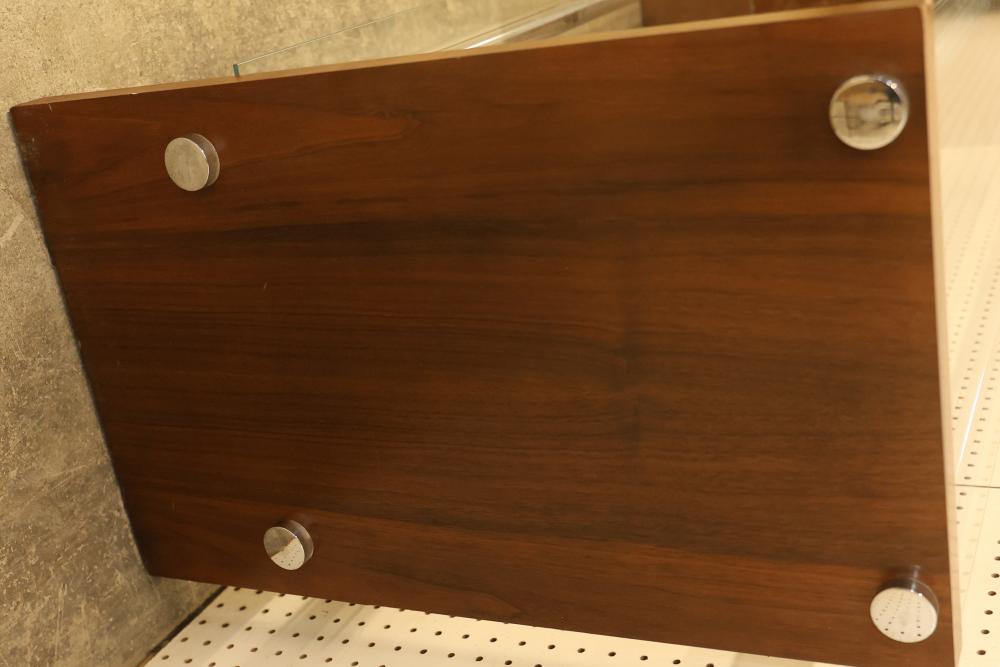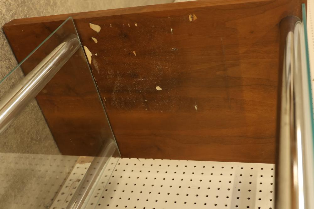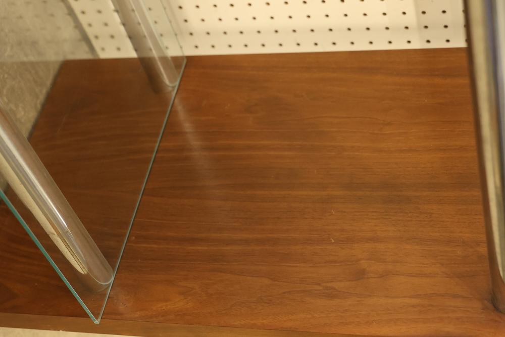 Modern Display Shelving Unit with Wooden Sides and Glass Shelves. Features wooden sides, metal bars, and removable glass shelves. Measures approximately 26 inches high, 55 inches wide, and 16 inches deep. Pickup only.