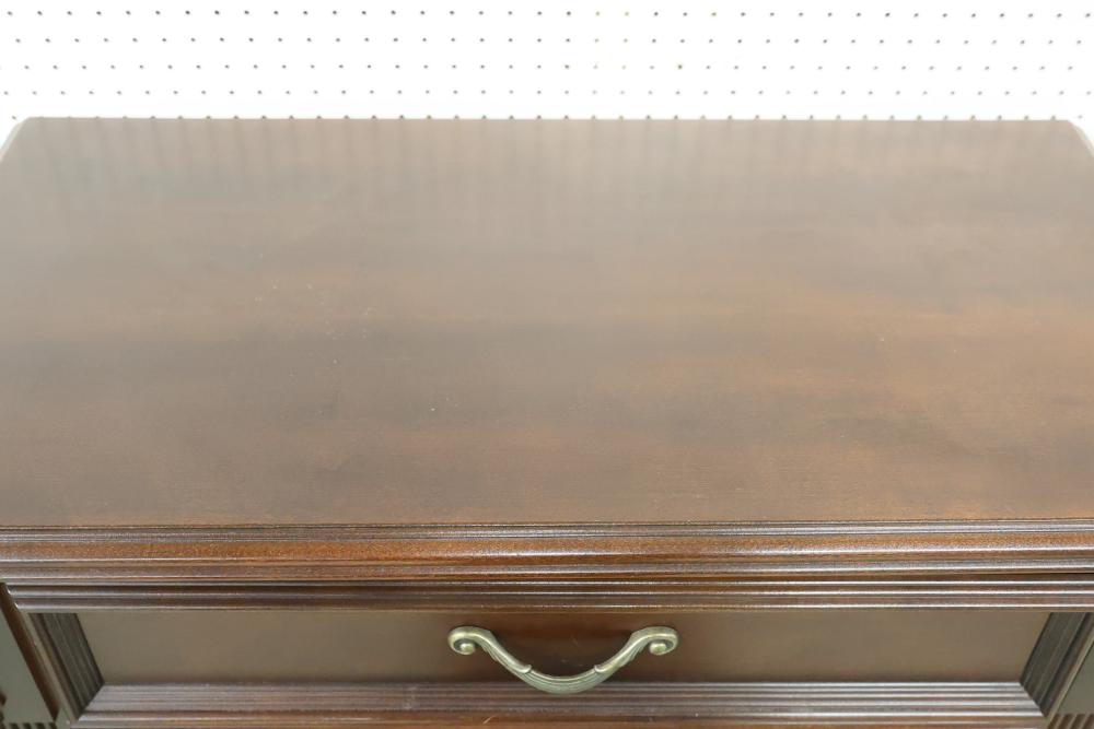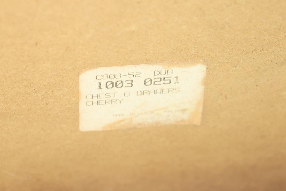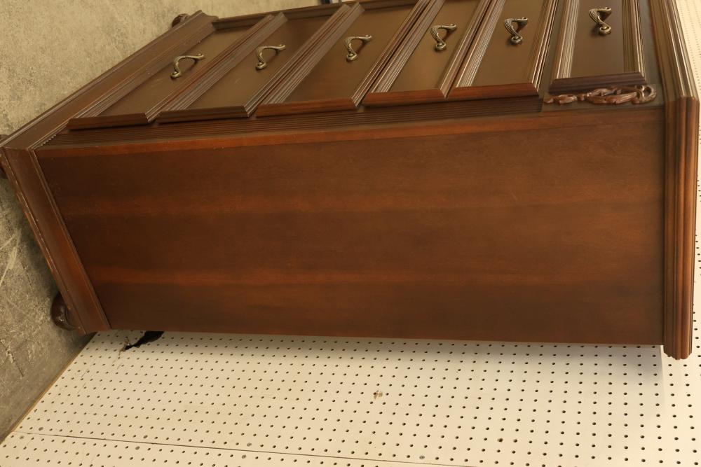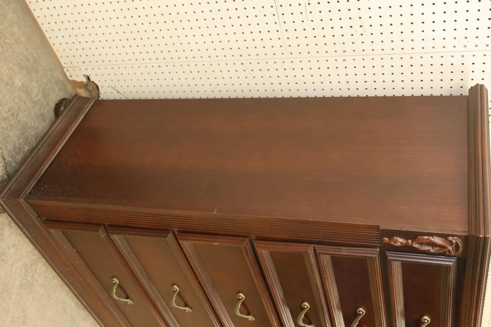 5-Drawer Dresser With Cherry Finish, Bunt Feet, and Applied Carving. Features all-matching metal pulls, a rich cherry finish, decorative applied carving, and bunt feet. Measures approximately 53 inches high, 34.5 inches wide, and 19 inches deep. Pickup only.