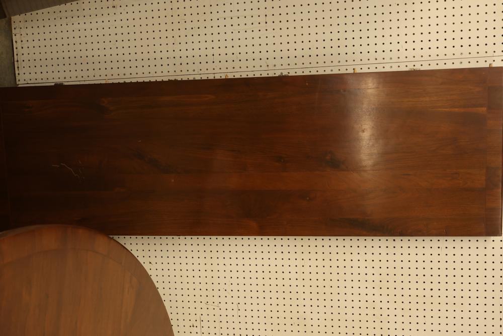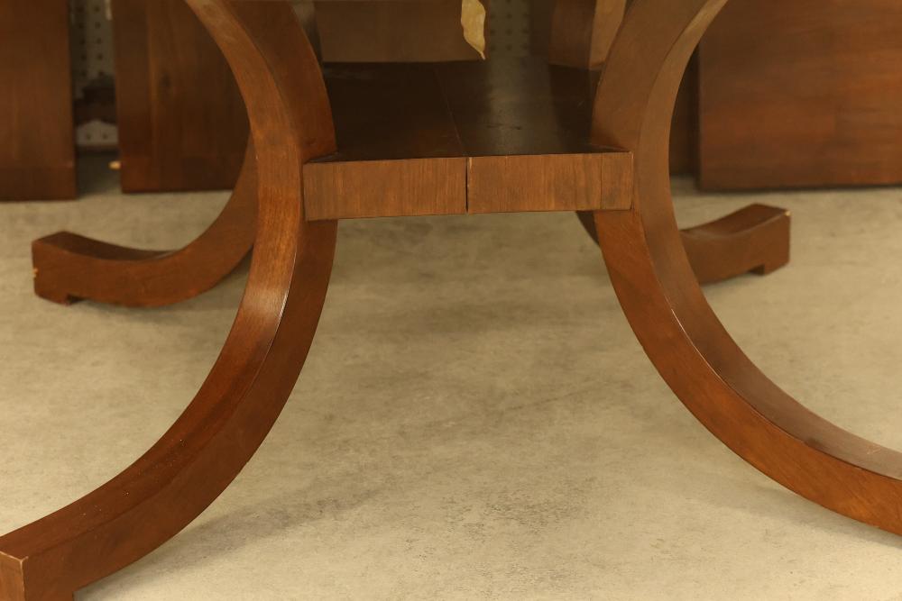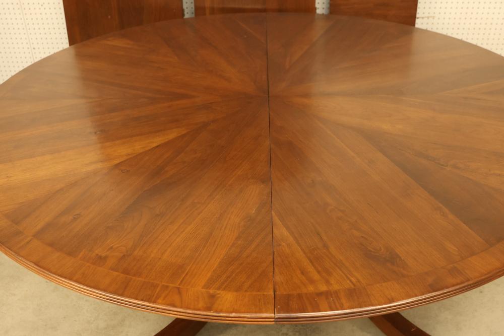 Round Wooden Expandable Dining Table. Table measures approximately 29 inches high with a 72 inch diameter. Features a wooden finish and comes with two leaves measuring approximately 72 inches long by 22 inches wide each. Includes two base extensions, one measuring 44 inches long by 15.75 inches wide and one measuring 22.25 inches long by 15.75 inches wide. Pickup only.
