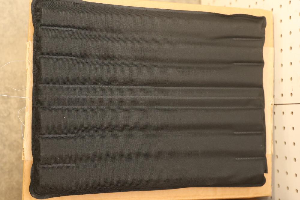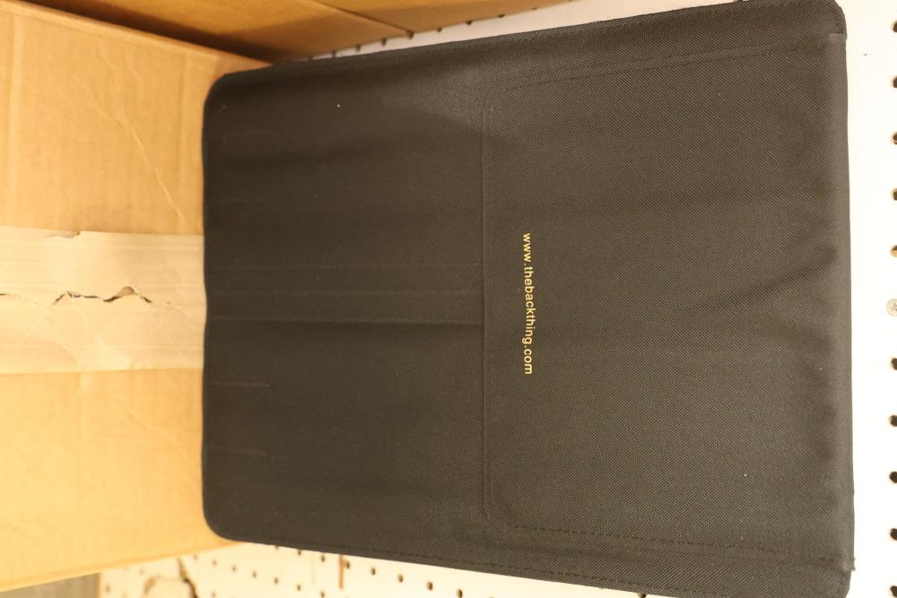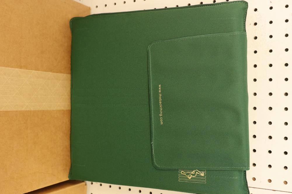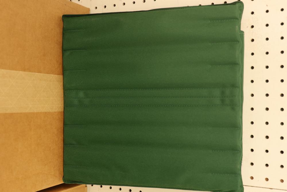 11 Cases of Backthings with Multiple Blue, Green, and Black Cushions. Includes 48 blue 6-slat cushions with 1-inch foam, 40 green 8-slat cushions with 1-inch foam, 25 black 6-slat cushions with 1/4-inch foam, and 10 black 6-slat cushions with 1-inch foam. Used for back support on chairs. Pickup only.