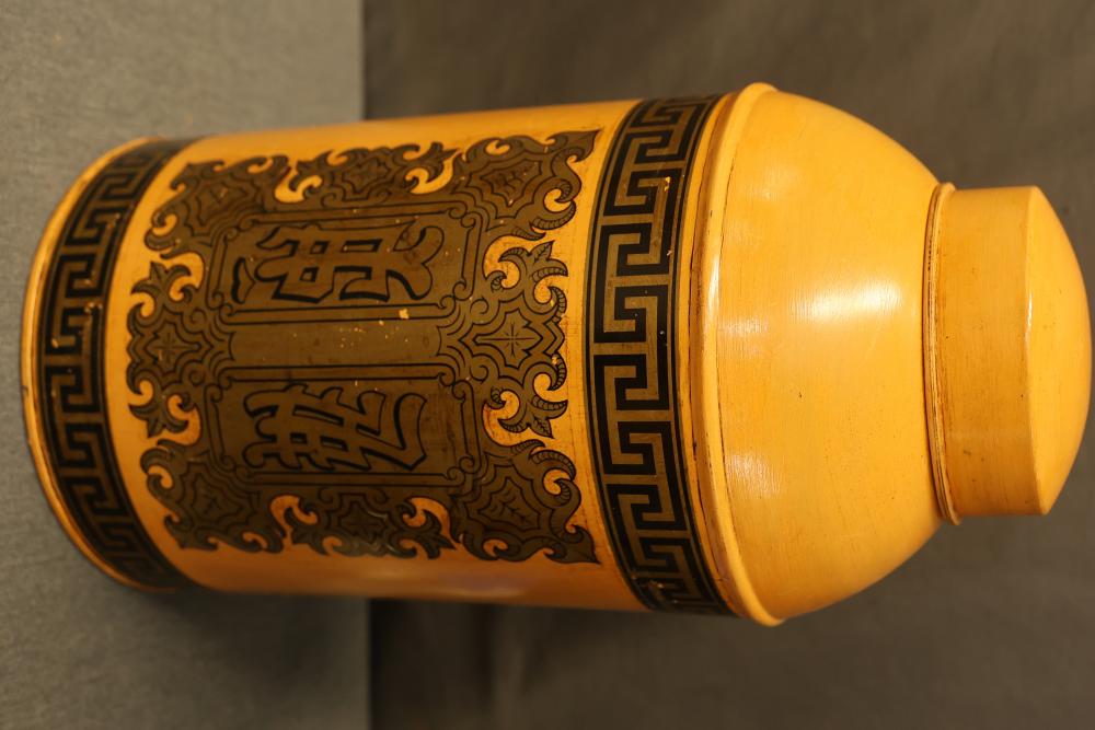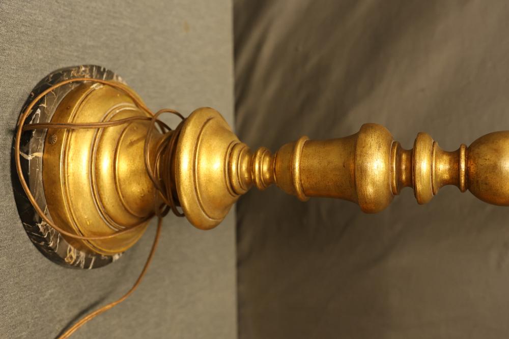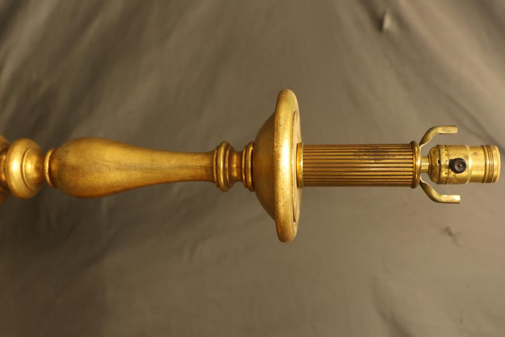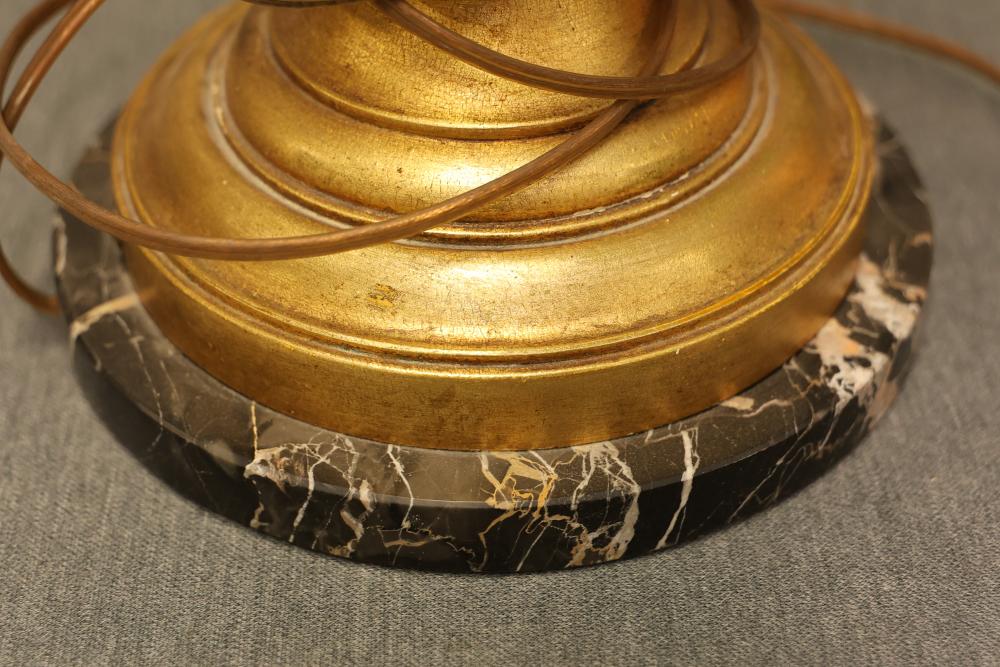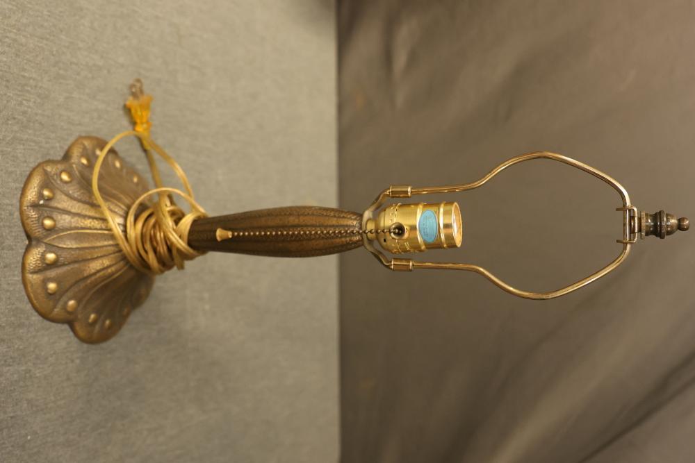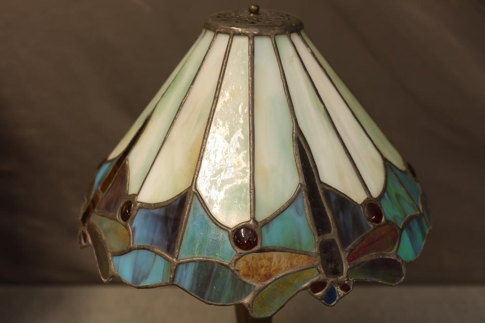 18 Inch Bronze-Toned Lamp with Flared Feet and Leaded Stained Glass Style Lamp Shade featuring a Dragonfly design. Includes a 30.5 Inch Candlestick Brass Lamp with Decorative Base and a Decorative Tea Caddy with Chinoiserie design. Both lamps are functional, but light bulbs are not included. Pickup only.