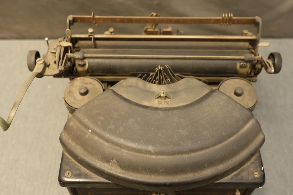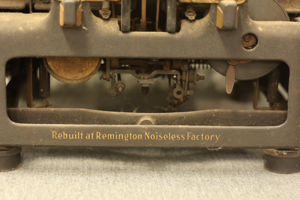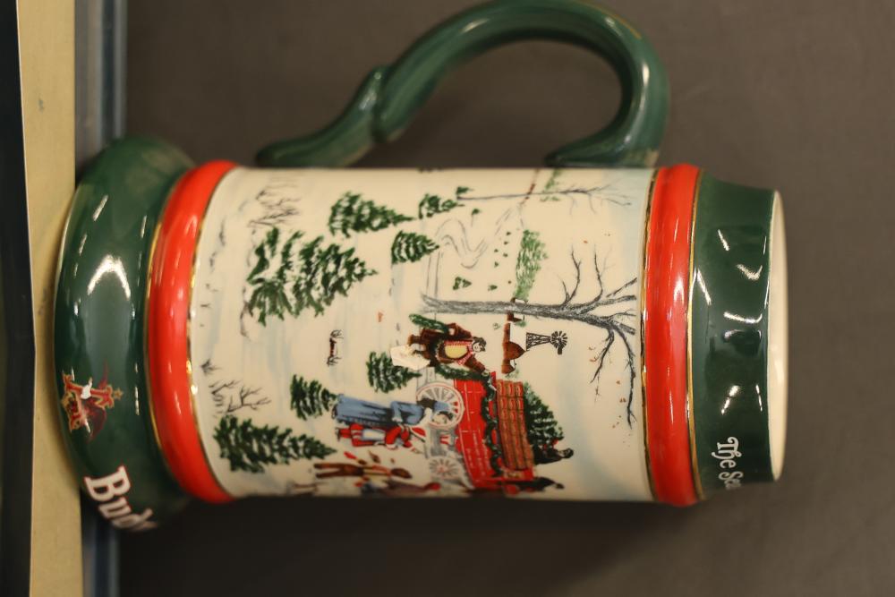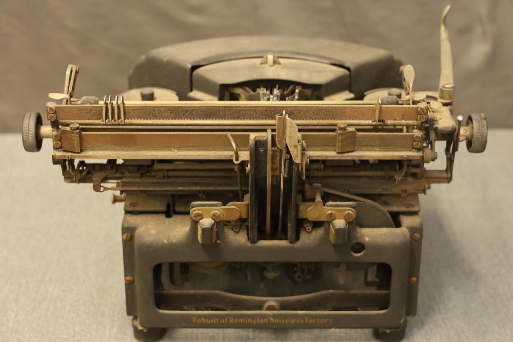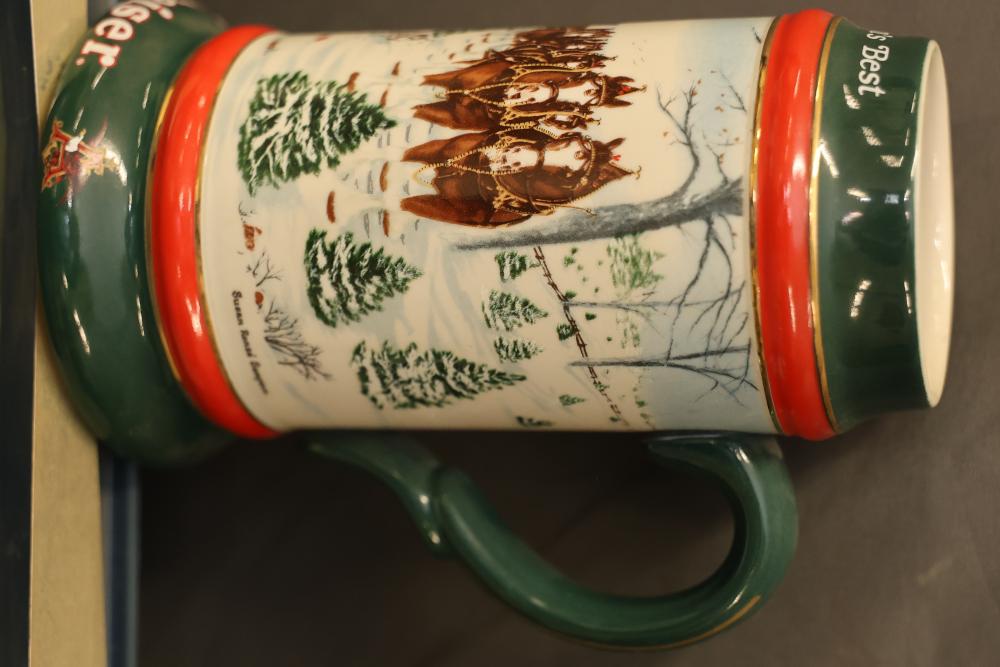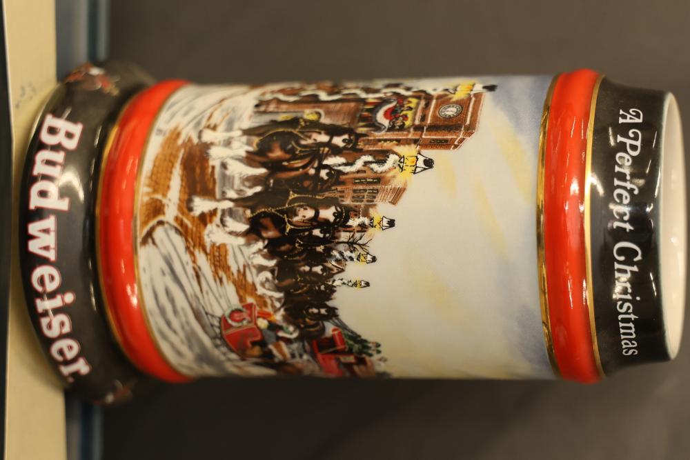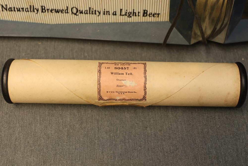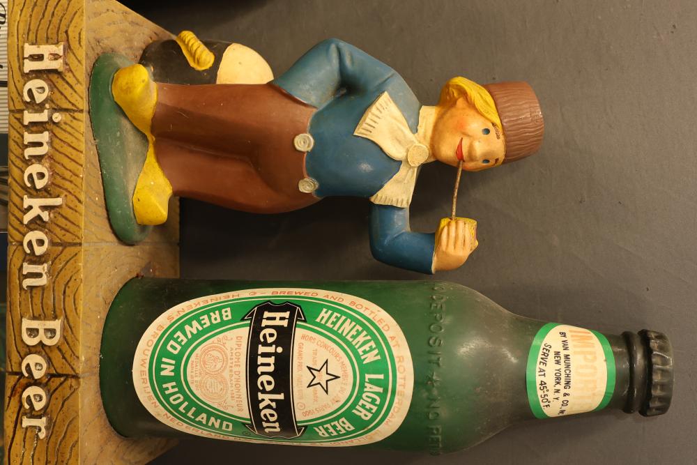 Vintage items including Remington Noiseless typewriter, Chief Croker fire extinguisher, vintage tools, Budweiser and Seagrams beer steins, and William Tell's "Overture" Piano roll. Additional items include beer-related advertising pieces, decorative plates, a heart-shaped crystal dish, and a selection of silver utensils. Pickup only.