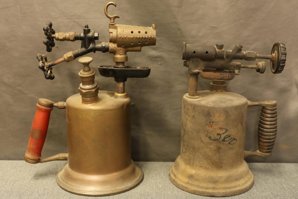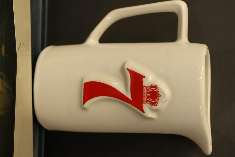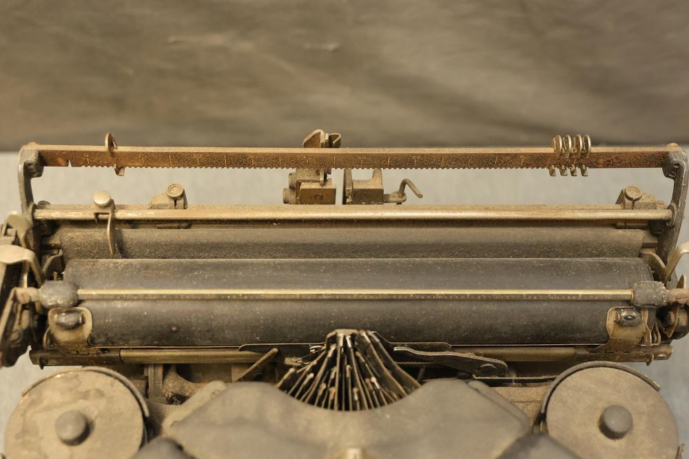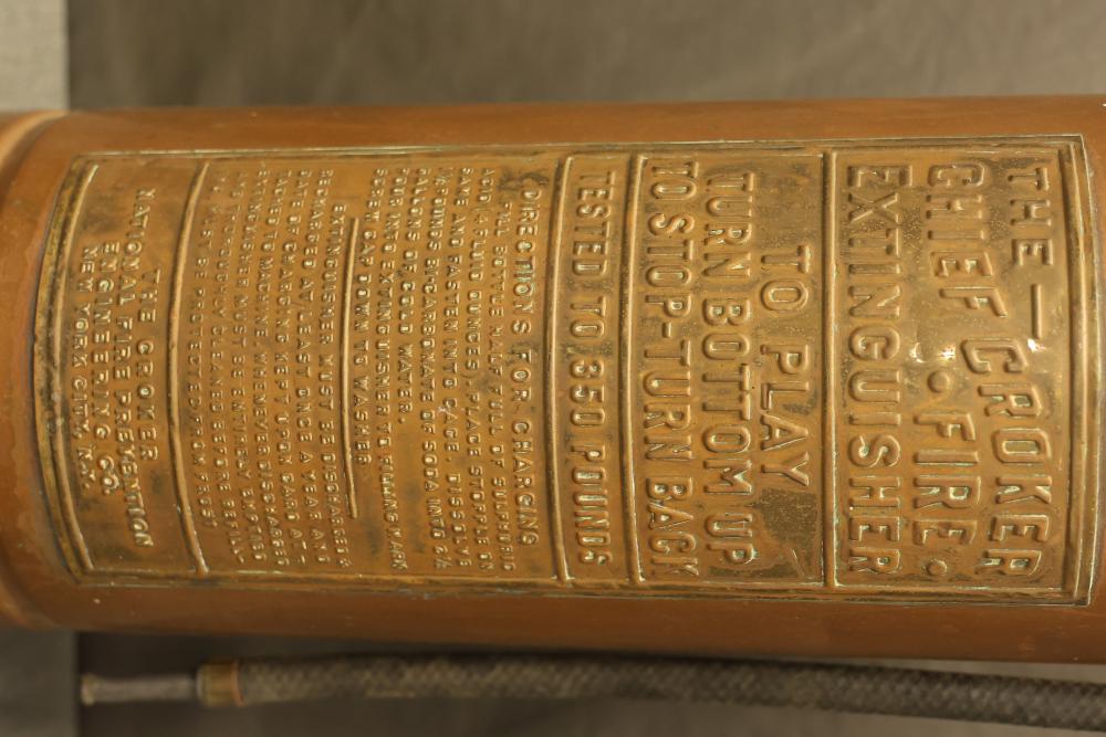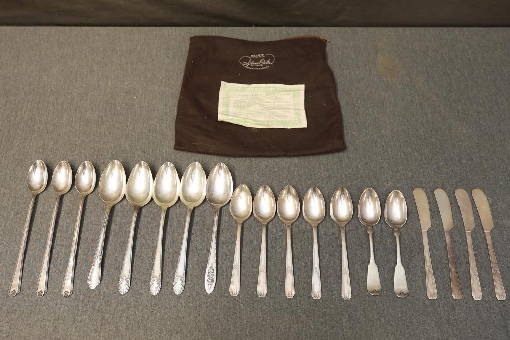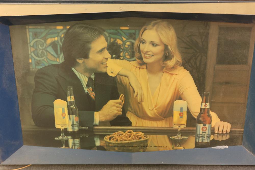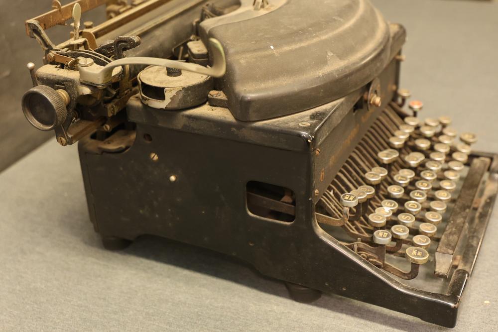 Vintage items including Remington Noiseless typewriter, Chief Croker fire extinguisher, vintage tools, Budweiser and Seagrams beer steins, and William Tell's "Overture" Piano roll. Additional items include beer-related advertising pieces, decorative plates, a heart-shaped crystal dish, and a selection of silver utensils. Pickup only.