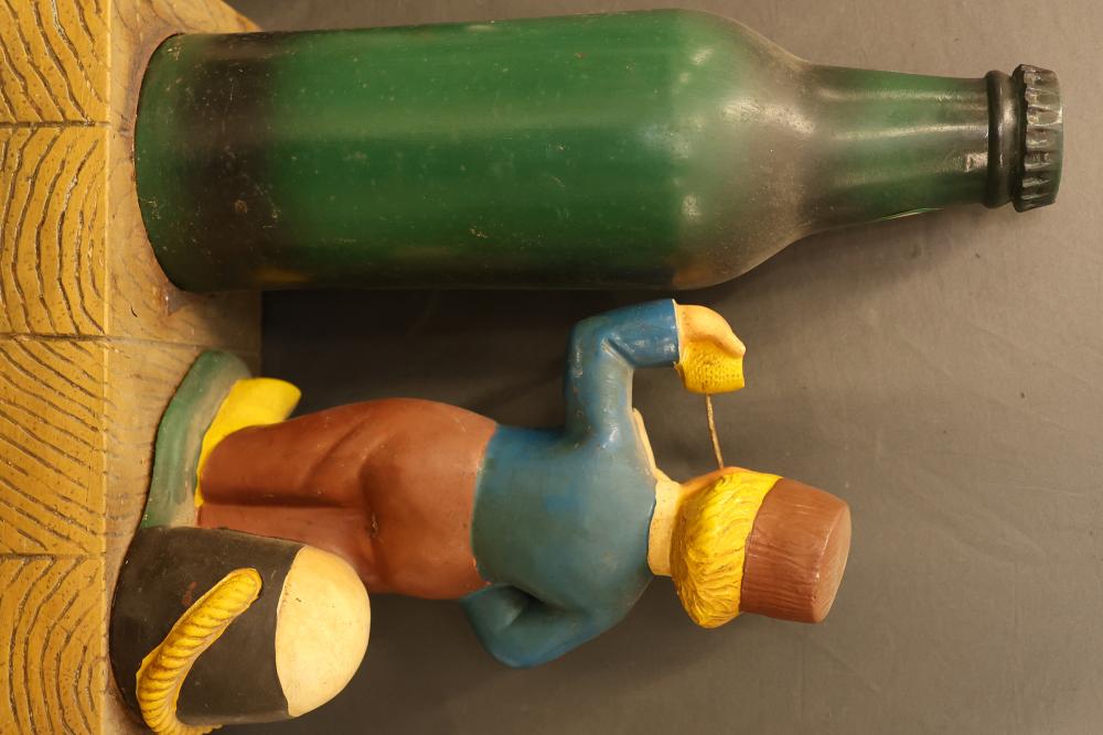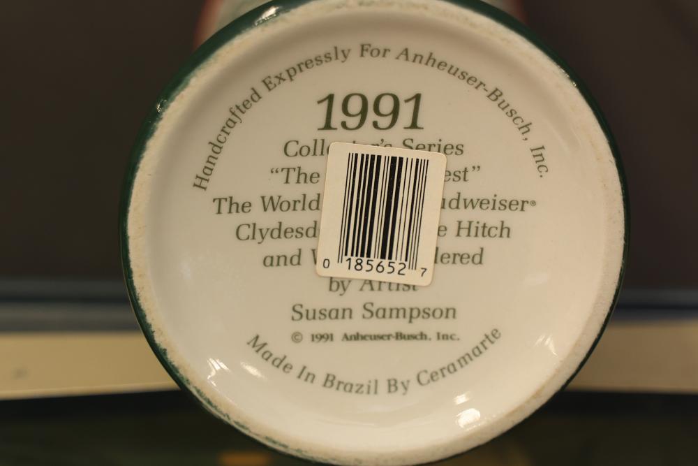 Items include Maitland Smith hall table with chinoiserie details; Mohonk Mountain House brass single candlestick table lamps; Metaxa ouzo ceramic decanters; Pulaski Furniture Corporation mirrored-back display cabinet; E. Ingraham & Co. gingerbread mantle clock; wall hanging tapestry; Budweiser, NASCAR & Germanic designs beer steins; framed mixed media artwork on canvas depicting flowers & butterflies; Ethan Allen expandable dining table/chairs; The Beatles "Why Don't We Do It in the Road?" promotional poster; vintage Art Deco china cabinet; wood-carved animal figurines; Zebco/Penn Fishing/Shakespeare Fishing fishing rods; framed lithograph of "Figuren" by Louis Favre; stoneware crocks; paper mache pintail drake & hen decoys & more. Items are located in Pleasant Valley, NY.