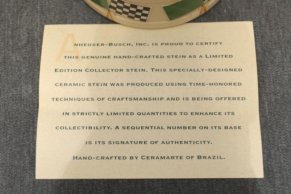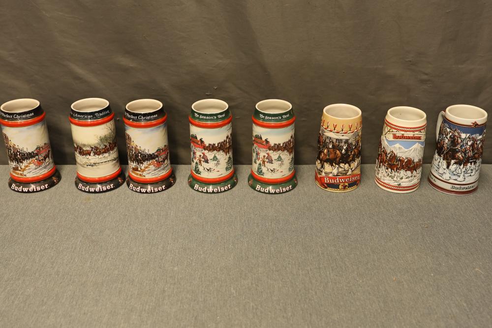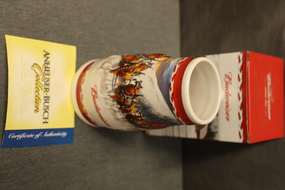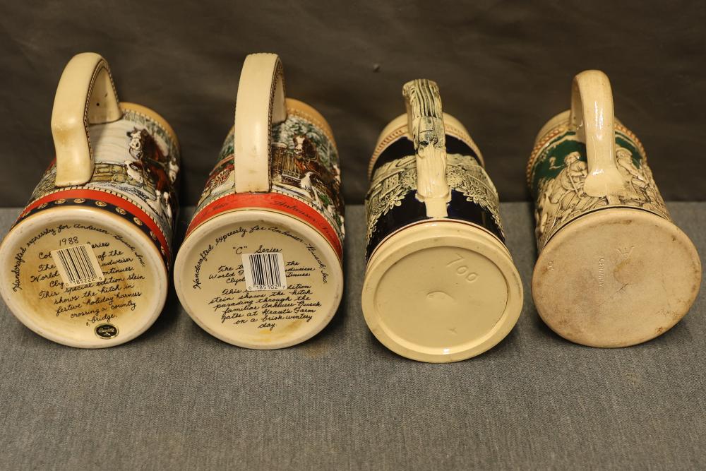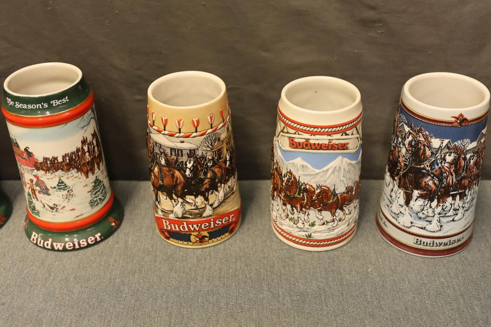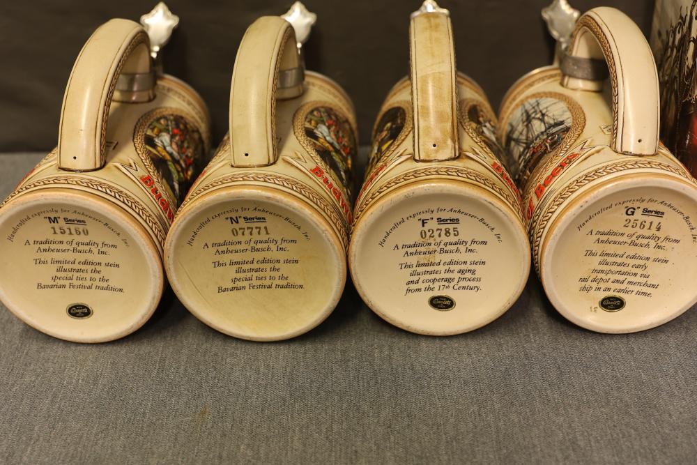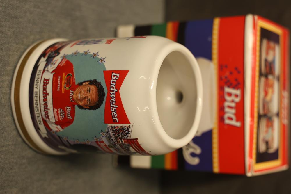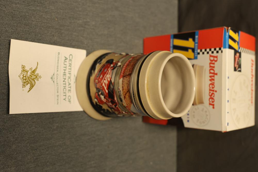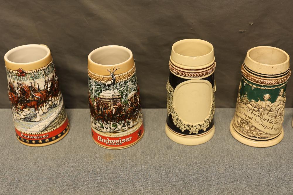 43 Beer Steins With Budweiser, Nascar, And Germanic Designs. Includes 35 unboxed beer steins and 8 new-in-box steins (boxes removed for photography). Features Anheuser Busch steins, Budweiser holiday and anniversary pieces, Nascar-themed commemorative steins, and Germanic-designed steins with phrases. Pickup only.