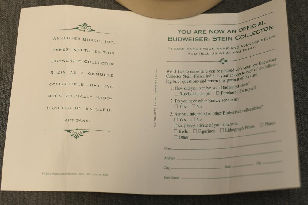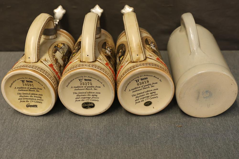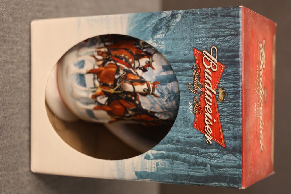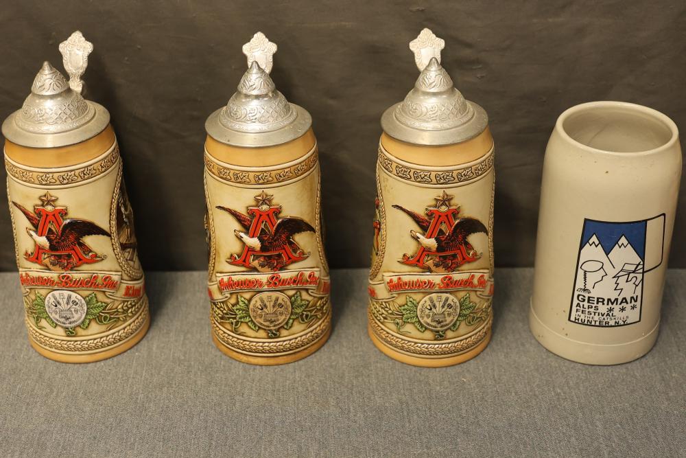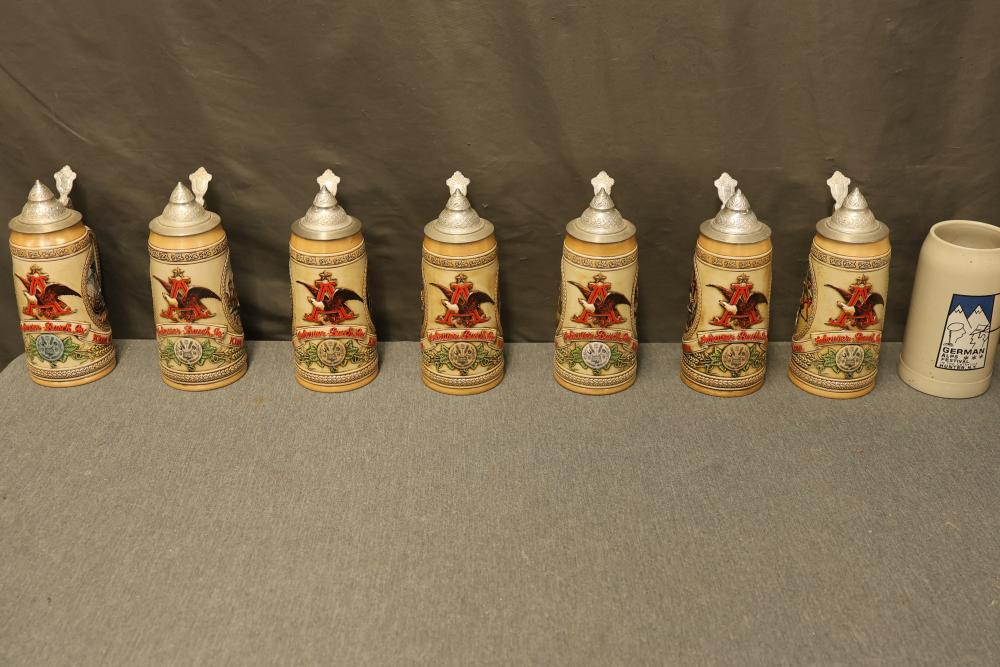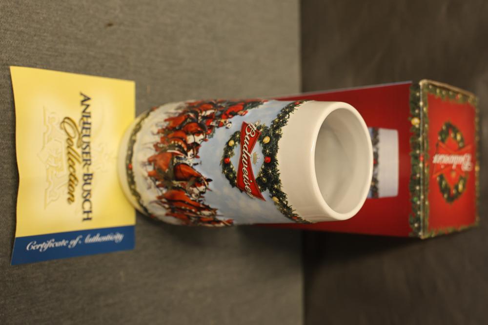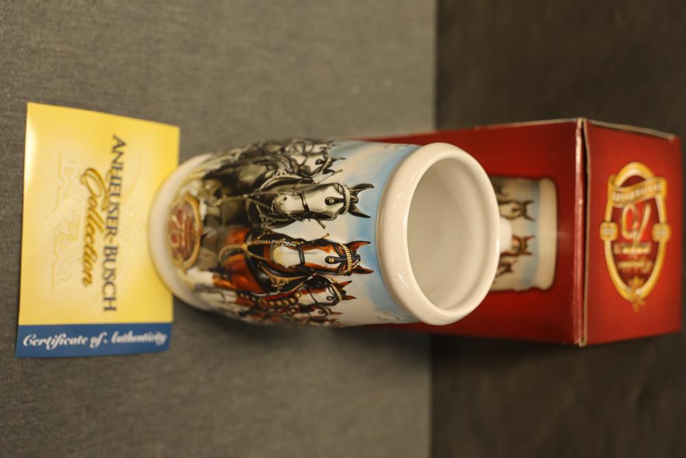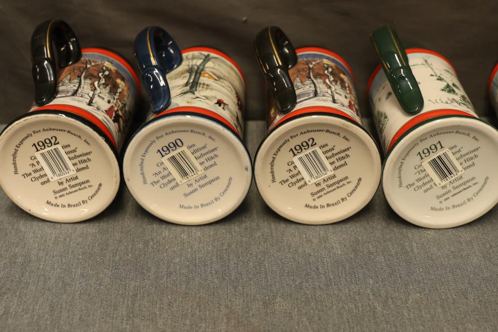 43 Beer Steins With Budweiser, Nascar, And Germanic Designs. Includes 35 unboxed beer steins and 8 new-in-box steins (boxes removed for photography). Features Anheuser Busch steins, Budweiser holiday and anniversary pieces, Nascar-themed commemorative steins, and Germanic-designed steins with phrases. Pickup only.
