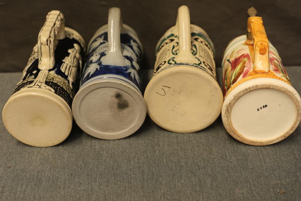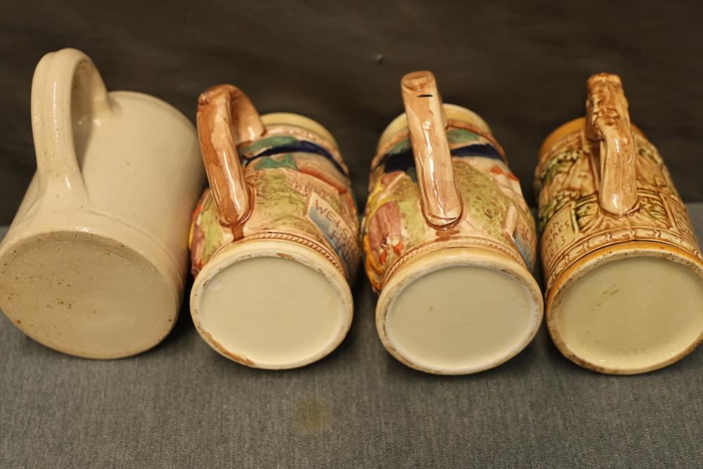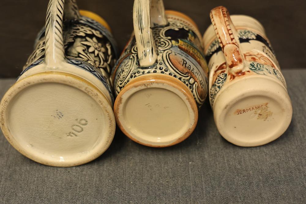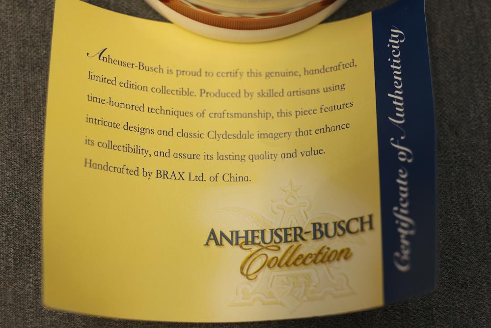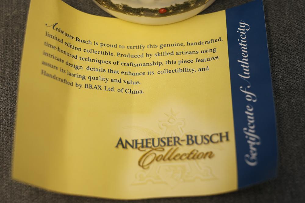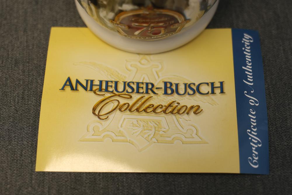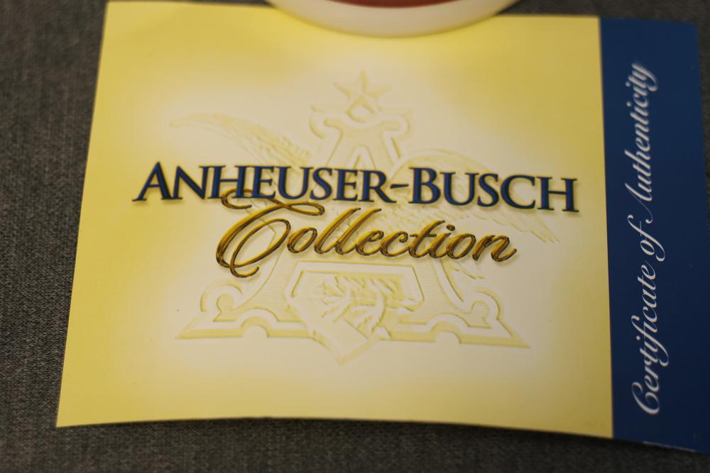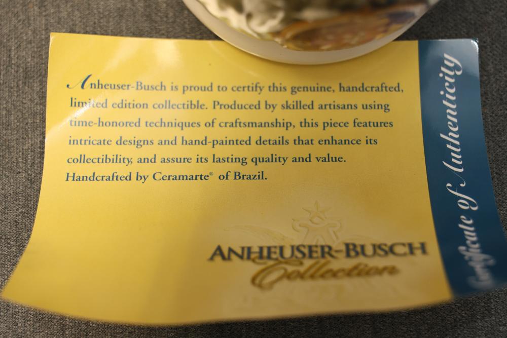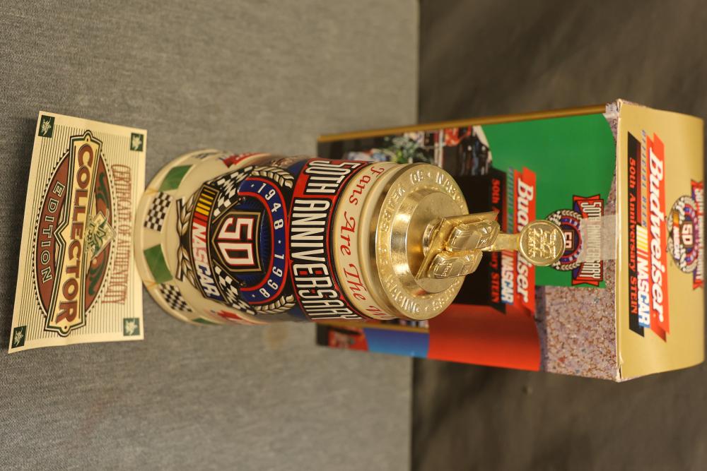 43 Beer Steins With Budweiser, Nascar, And Germanic Designs. Includes 35 unboxed beer steins and 8 new-in-box steins (boxes removed for photography). Features Anheuser Busch steins, Budweiser holiday and anniversary pieces, Nascar-themed commemorative steins, and Germanic-designed steins with phrases. Pickup only.