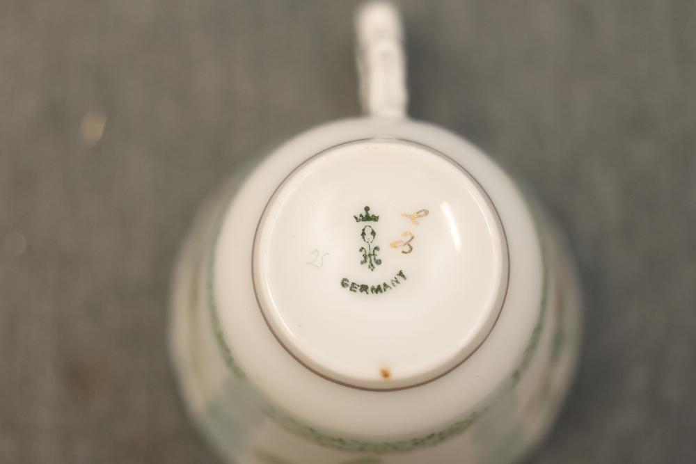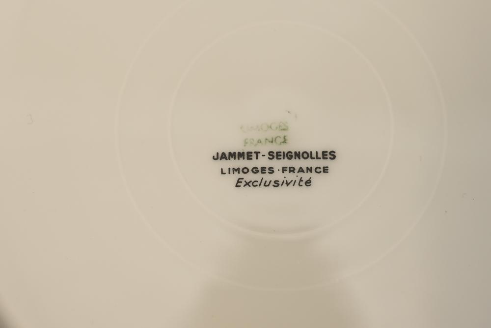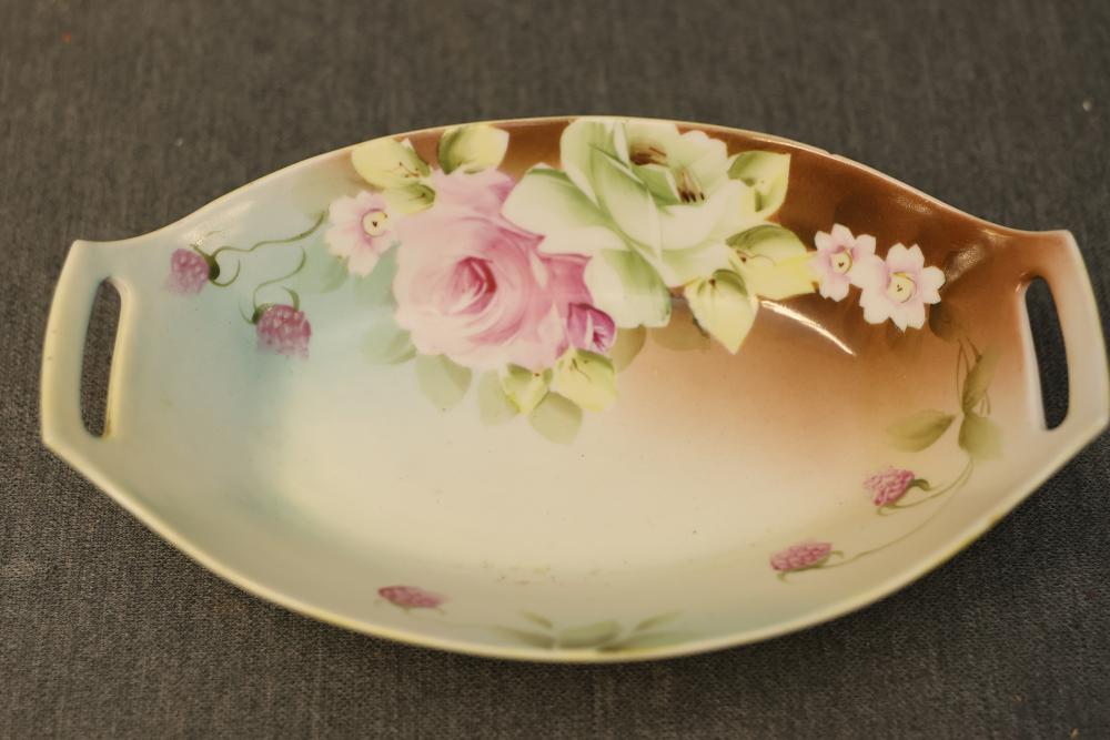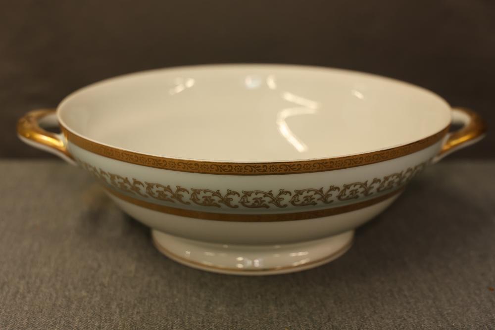 Dishware Assortment in Limoges China, Hutschenreuther, Noritake, Hermann Ohme, and Lenox. Includes 12 dining plates, 1 serving tray, and 2 dual-handled serving bowls in Limoges China, a Hutschenreuther Selb Bavaria porcelain plate, a Noritake relish dish, 3 tea saucers and 3 teacups by Hermann Ohme, and 2 Lenox Dorian nut dishes with a cabbage leaf design. Pickup only.