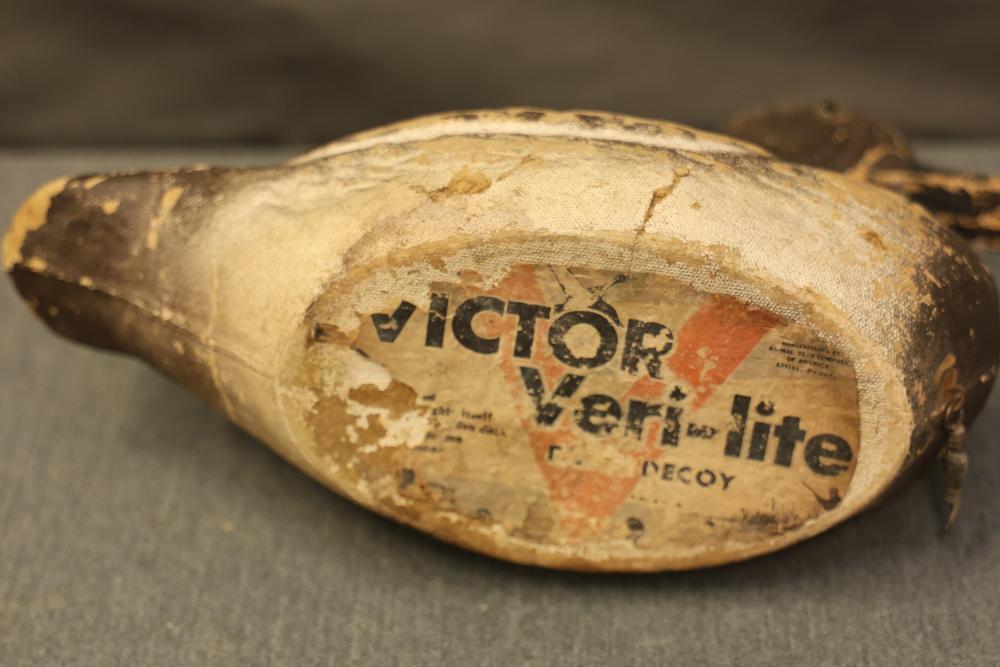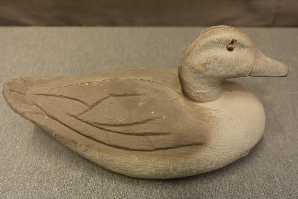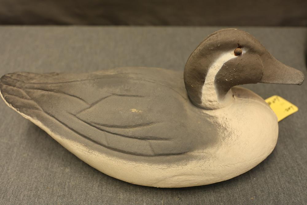 Paper mache pintail drake and hen decoys, featuring designs of a pintail drake and pintail hen. One decoy is damaged with a broken neck. Refer to images for additional markings and details.