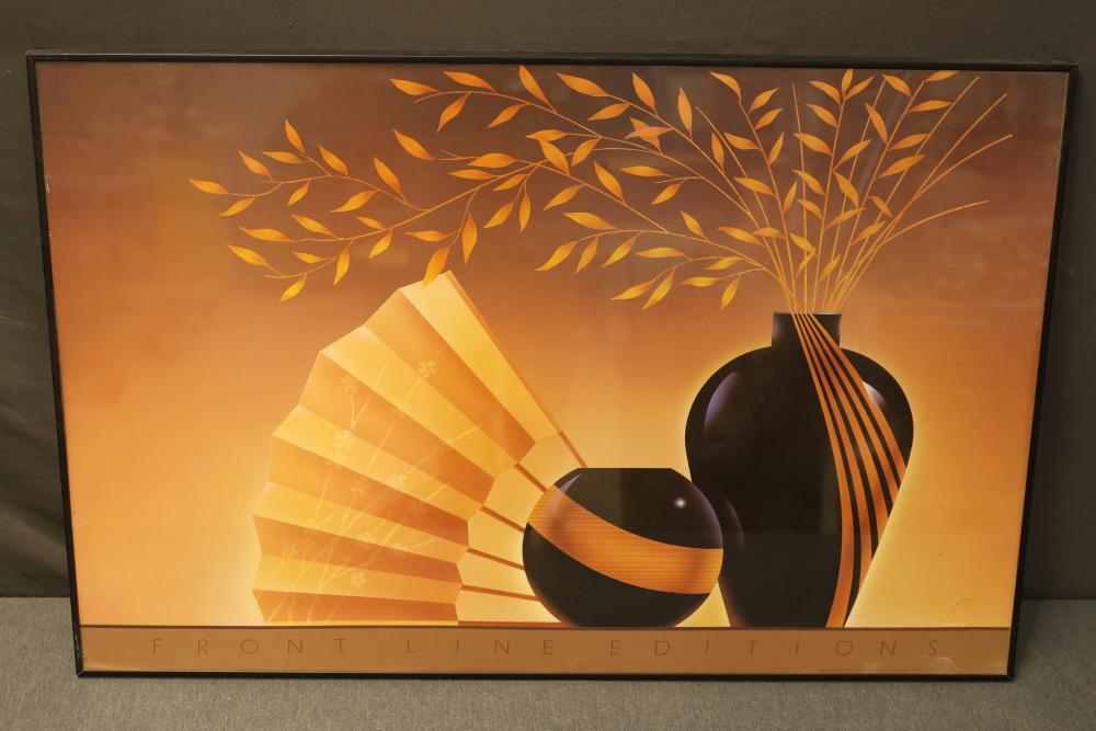 Items include Maitland Smith hall table with chinoiserie details; Mohonk Mountain House brass single candlestick table lamps; Metaxa ouzo ceramic decanters; Pulaski Furniture Corporation mirrored-back display cabinet; E. Ingraham & Co. gingerbread mantle clock; wall hanging tapestry; Budweiser, NASCAR & Germanic designs beer steins; framed mixed media artwork on canvas depicting flowers & butterflies; Ethan Allen expandable dining table/chairs; The Beatles "Why Don't We Do It in the Road?" promotional poster; vintage Art Deco china cabinet; wood-carved animal figurines; Zebco/Penn Fishing/Shakespeare Fishing fishing rods; framed lithograph of "Figuren" by Louis Favre; stoneware crocks; paper mache pintail drake & hen decoys & more. Items are located in Pleasant Valley, NY.