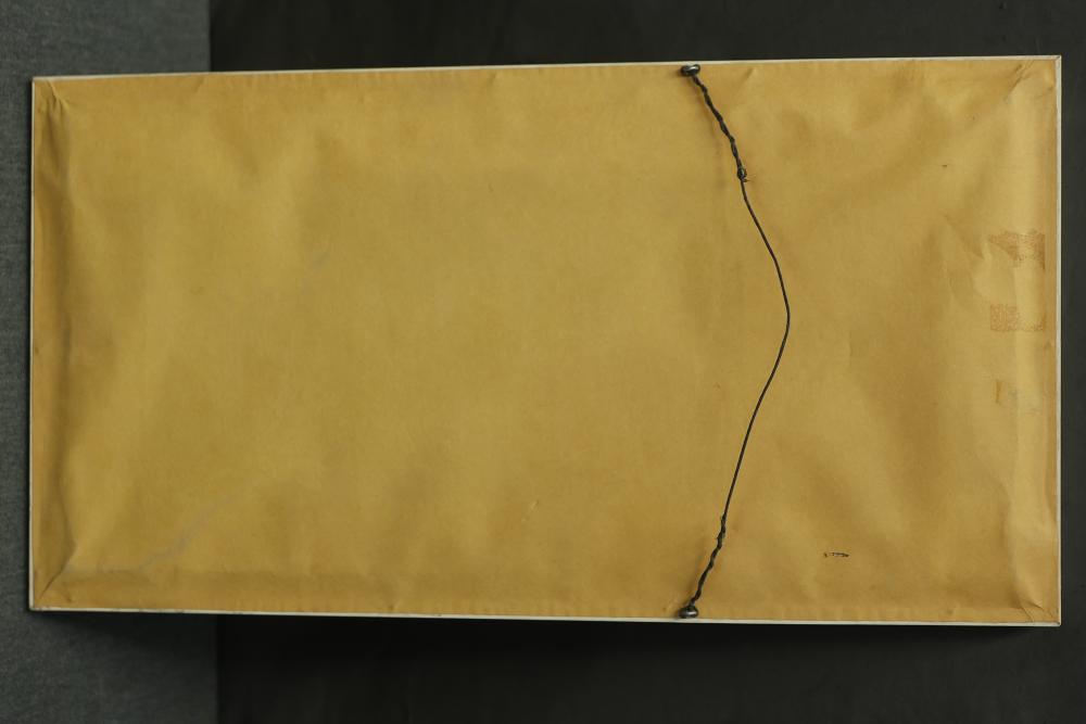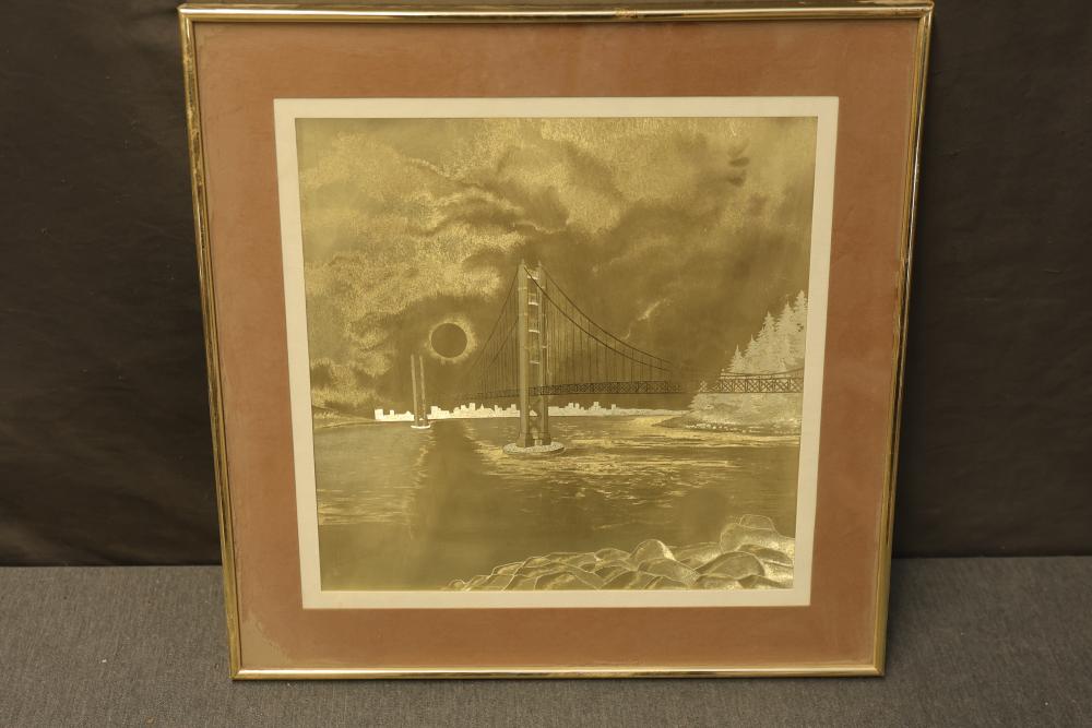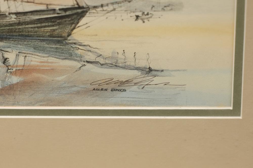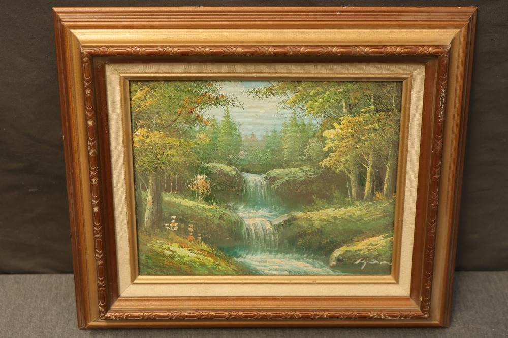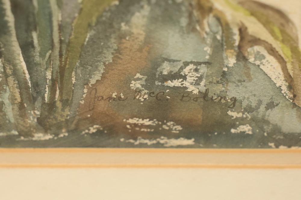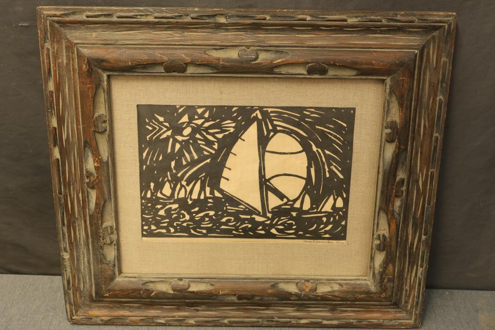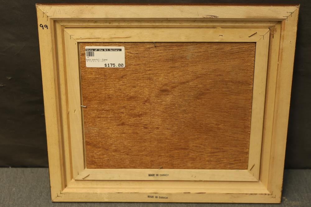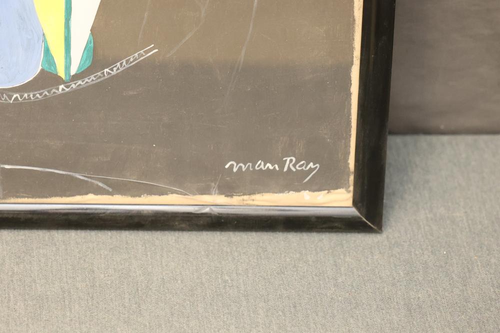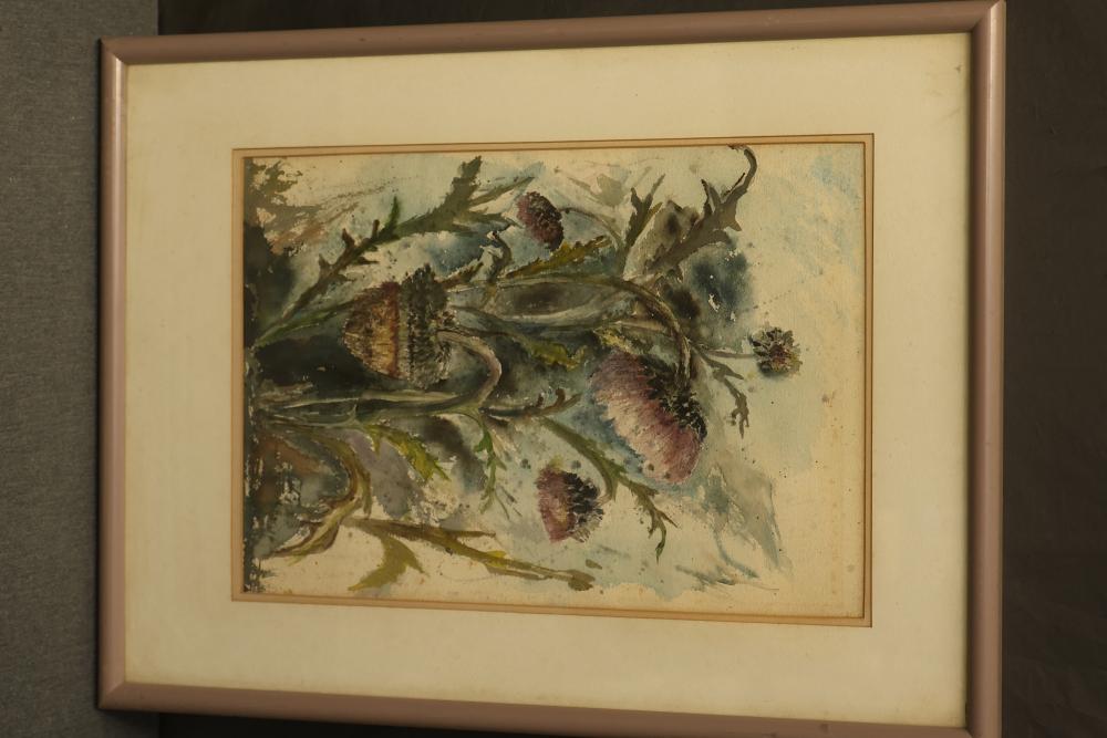 12 artwork pieces by different artists in varied mediums, including a framed print of "Acrobat" by Man Ray, watercolors such as "Frances P. Mesquita 1905" by Allen Hawkes and "Thistles" by Jane McConnaughey Boling, and "Double Waterfall," an oil on board signed as Lipman. Pieces range in size from approximately 36.25 inches long x 24.25 inches wide to approximately 14.5 inches long x 12.5 inches wide. Pickup only.