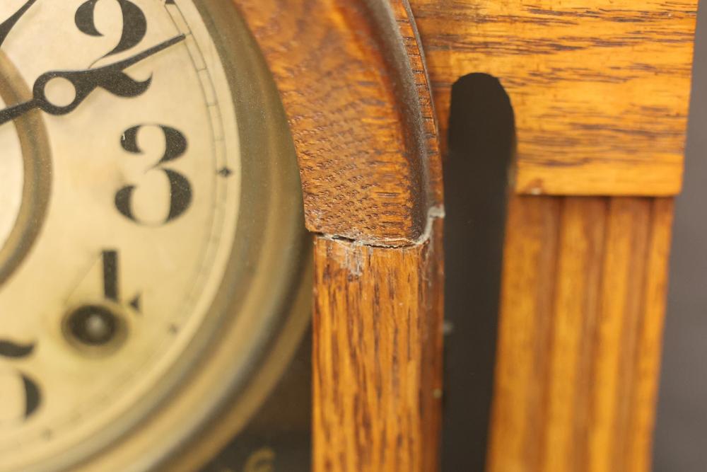 E. Ingraham & Co. Gingerbread Mantle Clock. Cabinet frame shows wear in some areas and is loose. Features an ornate wooden design with a glass front panel, clock face with bold numerals, and an internal pendulum. Pickup only.