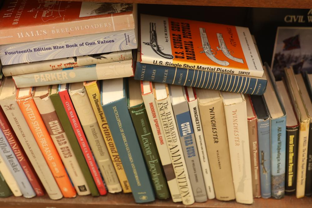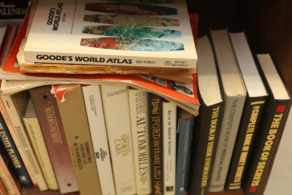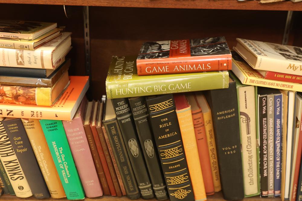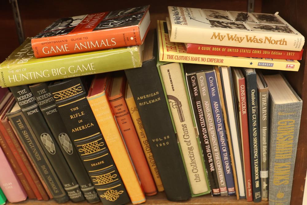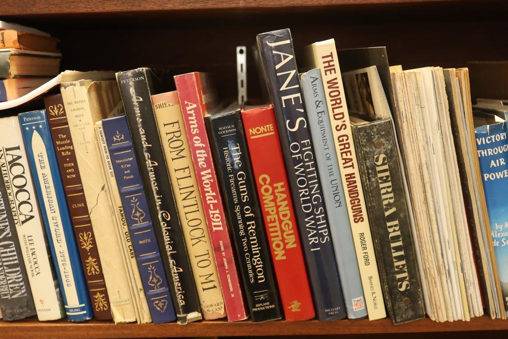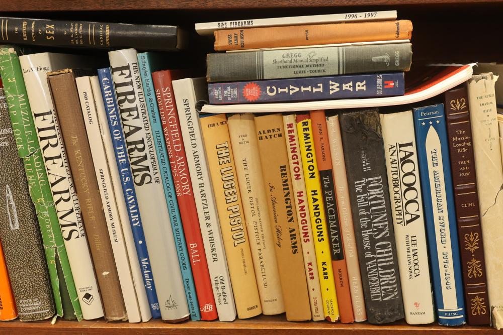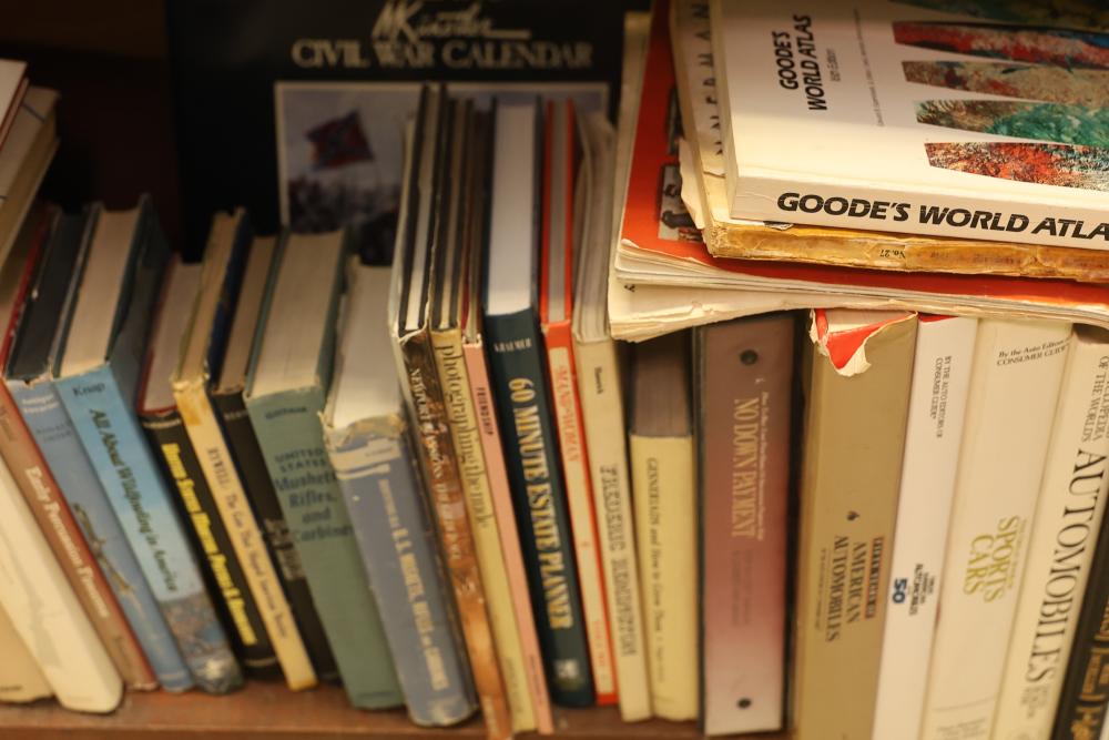 Book Collection on Gardening, Automobiles, Firearms, and Architecture with DVDs/VHS. Includes books by authors such as Leo Tolstoy, Stephen Crane, and Charles Edward Chapel. Covers topics including lawn and garden care, automotive history, firearms, and architectural design. Some VHS and DVDs are present. Bookshelf is not included. Pickup only.
