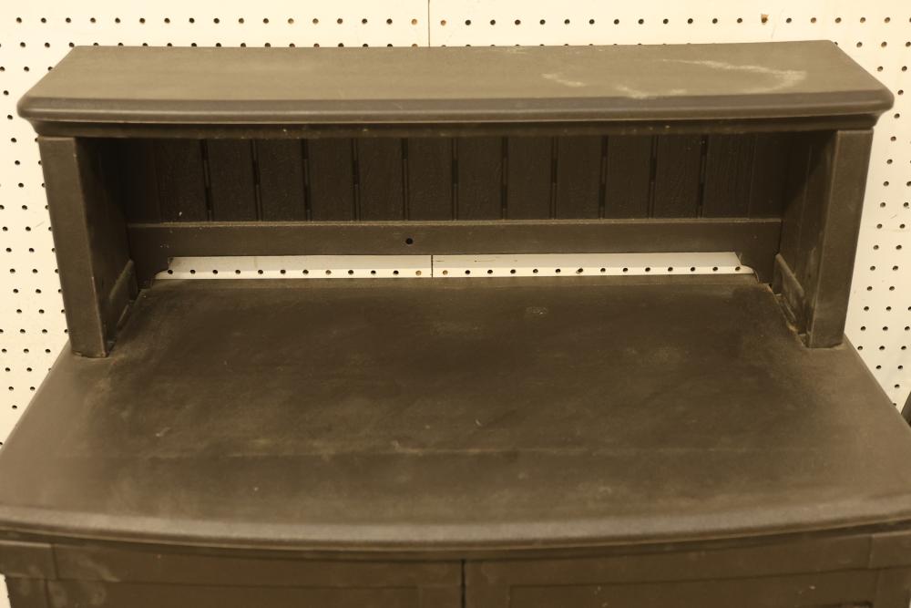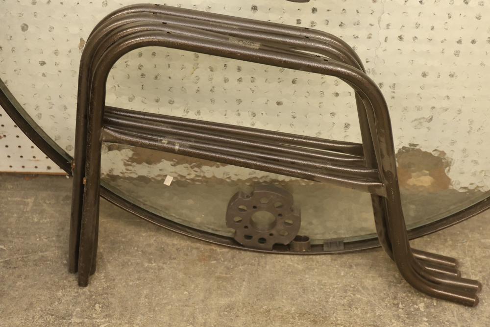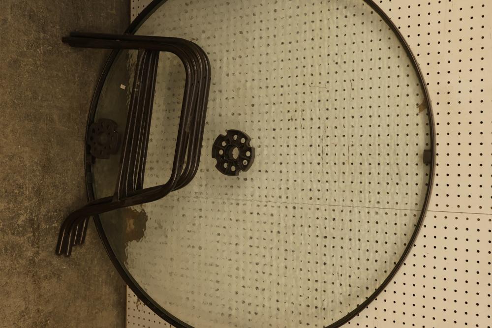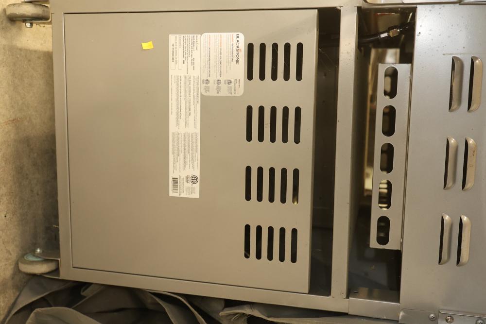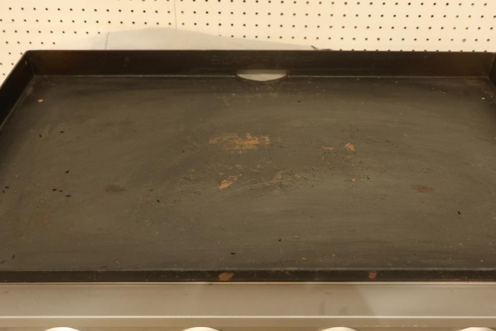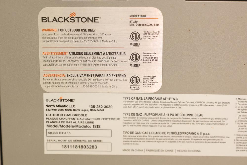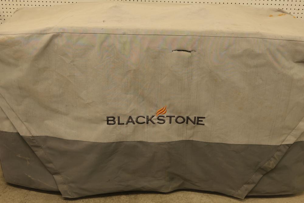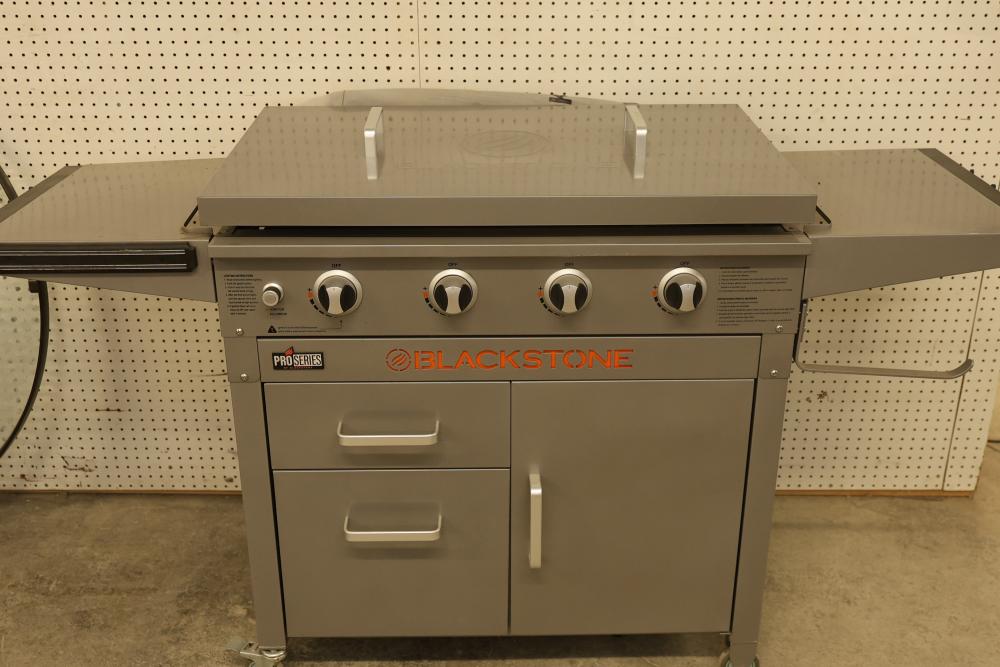 Patio Furniture with Blackstone Model 1818 ProSeries Outdoor 4-Burner Gas Griddle with cover (measures approximately 39.25 inches high, 67 inches wide, 23.5 inches deep). Includes a glass patio table (approximate 44-inch diameter, unassembled), 80-quart rolling cooler cart (measures approximately 33.5 inches high, 36 inches wide, 15.5 inches deep), Suncast rolling patio storage/prep station (measures approximately 44.5 inches high, 30 inches wide, 19 inches deep), 4 patio chairs (19.5-inch wide seats, two red and two green), and a rustic wooden wall sign featuring Matthew 18:20 (measures approximately 24 inches by 24 inches). Pickup only.