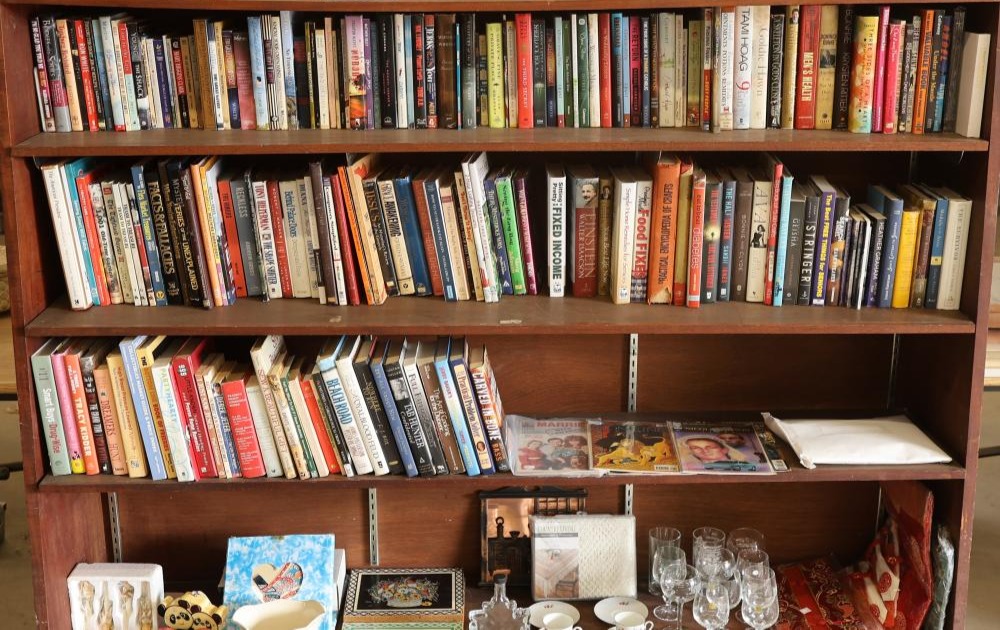 Book Collection of 197 Books with Comics, Stamp Collection, and Glassware. Includes works by Joel Osteen, F. Scott Fitzgerald, and James Patterson. Also features comics, a variety of stamps, and assorted glassware and decorative items. Bookshelf not included. Pickup only.