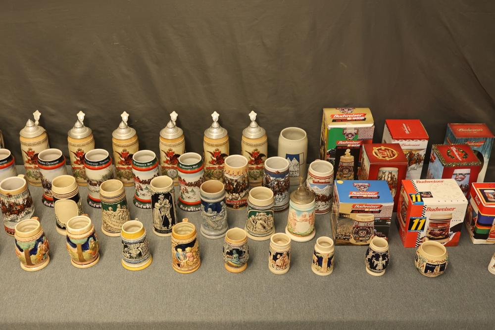 43 Beer Steins With Budweiser, Nascar, And Germanic Designs. Includes 35 unboxed beer steins and 8 new-in-box steins (boxes removed for photography). Features Anheuser Busch steins, Budweiser holiday and anniversary pieces, Nascar-themed commemorative steins, and Germanic-designed steins with phrases. Pickup only.