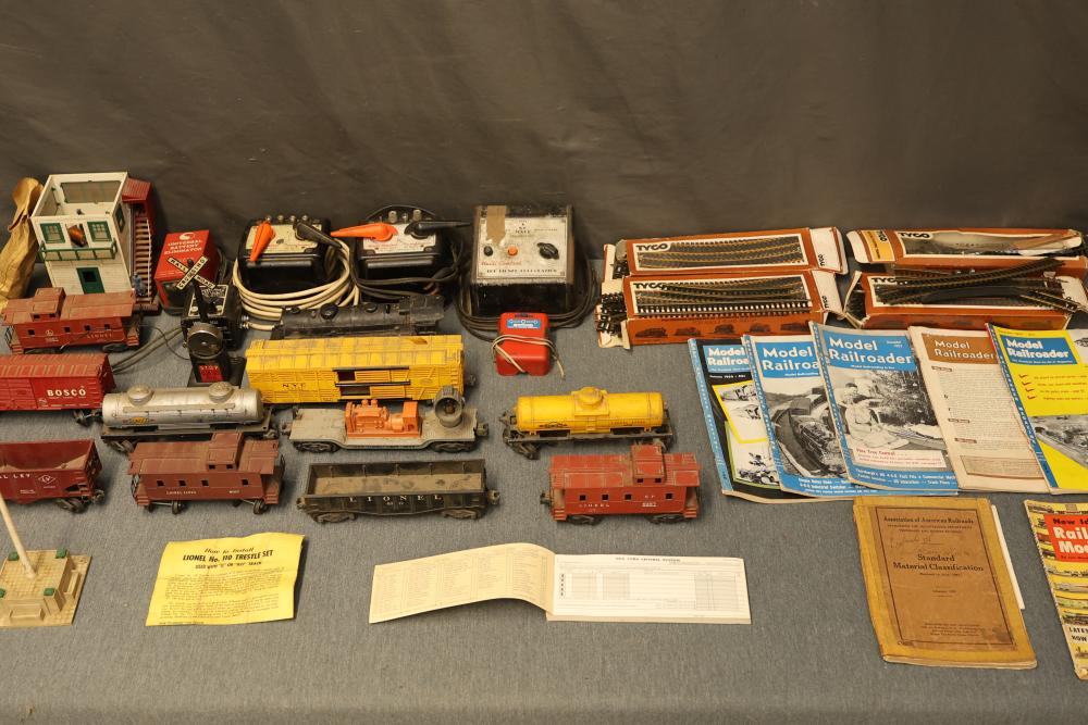 Lionel trains, transformers, tracks, and magazines. Includes two Lionel Type 1033 90 W transformers, contents of a Lionel 110 Trestle Set, Tyco railroad tracks, and 11 Lionel trains, featuring model 6015 Sunoco single dome tank car, model 6257 Lionel Caboose, and model 3620 Lionel Searchlight Car. Magazines included are 5 issues of Model Railroader, 1 issue of New Ideas in Railroad Modeling, and a booklet by the Association of American Railroads.