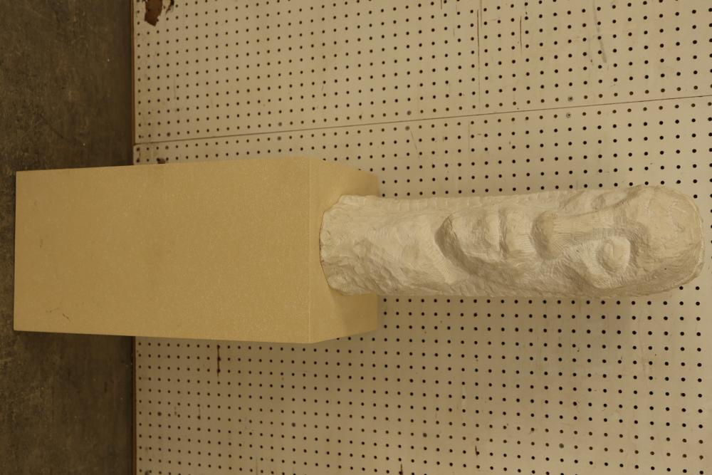 Solid Stone Carved Bust on Wood Pedestal in the Manner of Ludvik Durchanek. The bust measures 23 inches in height, with a total height of 47 inches including the pedestal. No visible signature is present. Pickup only.