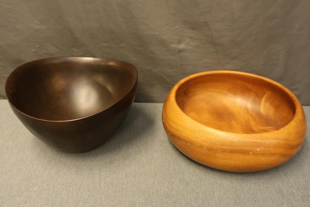 Dark Brown Wooden Oval Bowl and Rounded Hand Carved Wooden Bowl. The rounded bowl is marked on the bottom "Blair A, Honolulu, Monkey pod wood." Both bowls display smooth finishes and natural grain patterns. Pickup only.