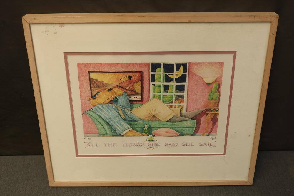 Framed limited edition lithograph of "All The Things She Said She Said," by Markus Pierson. Depicts an animated figure lounging in a room while using a telephone. Limited edition number 279/950. Measures approximately 21.25 inches long by 17.75 inches wide. Pickup only.