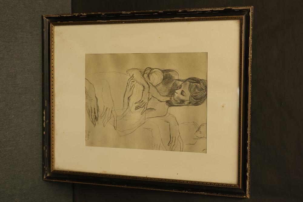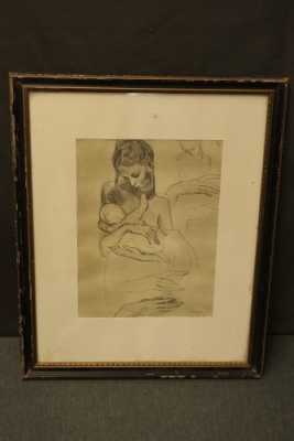 Framed print of "Mother and Child" pencil sketch by Picasso. Depicts a woman cradling a child. Signature in the bottom right of the print. Measures approximately 19.5 inches long and 15.5 inches wide. Pickup only.