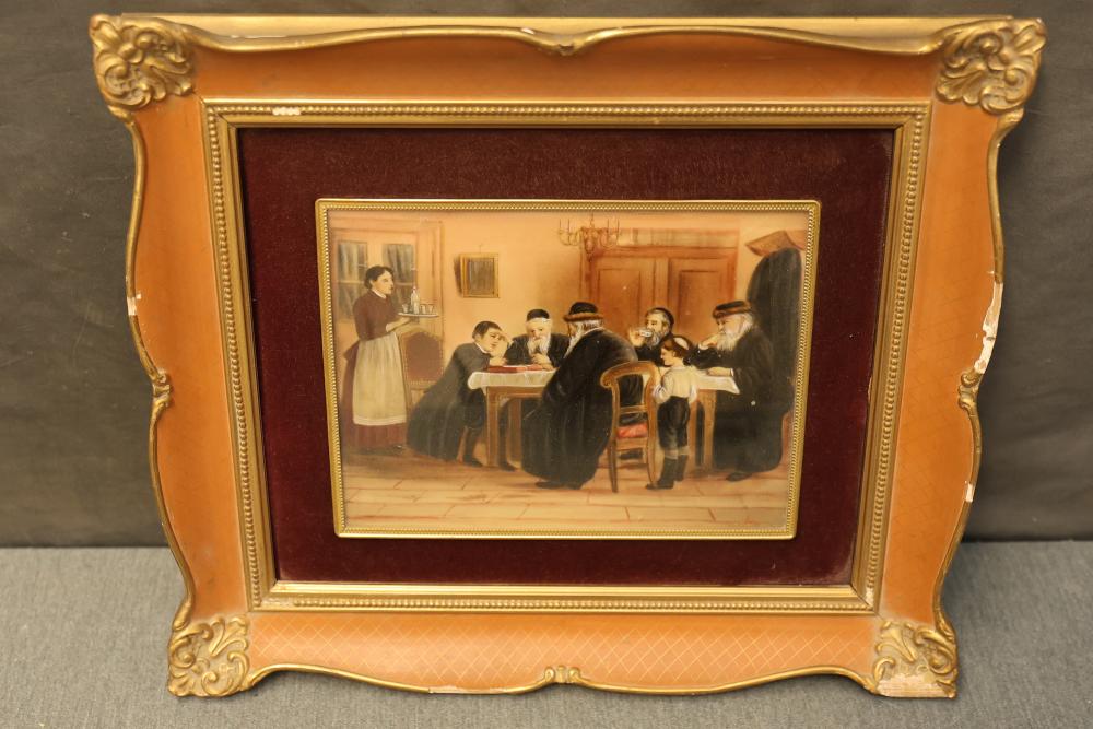 Framed print depicting a Judaica setting, titled "At the Rabbi's Table" by Willin. The signature is signed in the art. The frame features a decorative design and measures approximately 14.5 inches long by 12.5 inches wide.