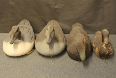 Paper mache pintail drake and hen decoys, featuring designs of a pintail drake and pintail hen. One decoy is damaged with a broken neck. Refer to images for additional markings and details.