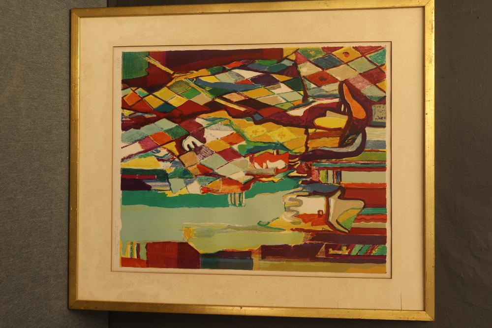 Framed lithograph of "Figuren" by Louis Favre, signed by the artist on the bottom right and marked as number 21/45 in a limited edition run. The artwork measures approximately 27 inches long and 23 inches wide. Pickup only.