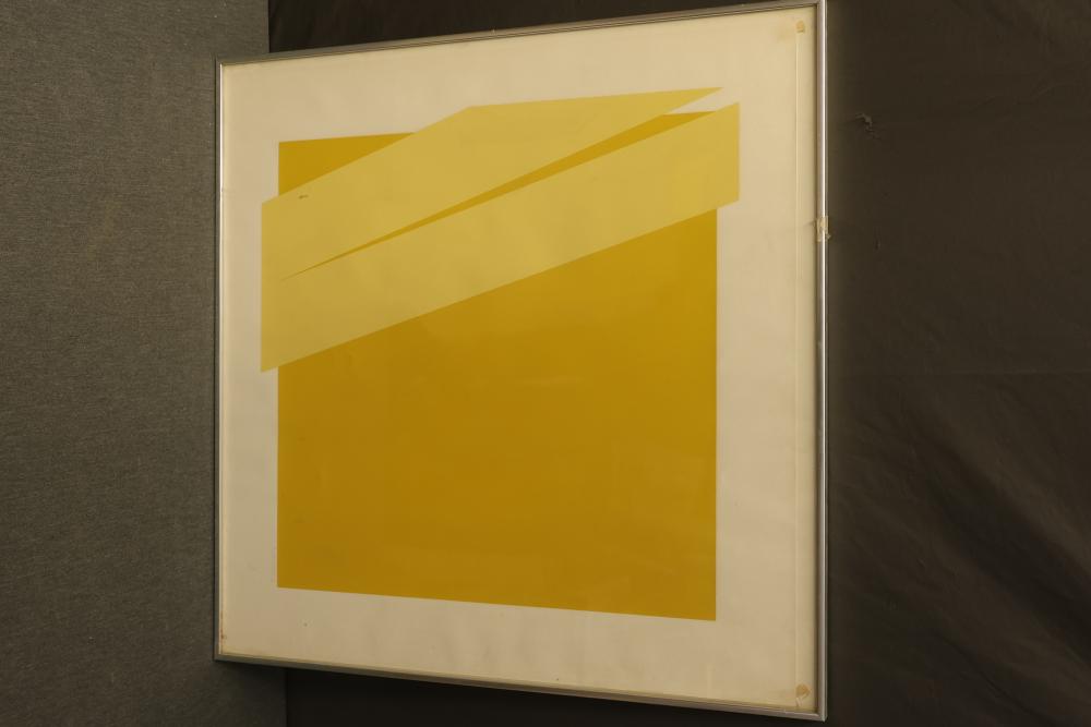 Abstract Yellow Box With Stripes, Untitled, Framed Lithograph, 4/50. This piece is part of a limited run, numbered '4/50' in the bottom left corner. Signed 'Condeso 76' in the bottom right corner. Measures approximately 30.25 inches long by 30.25 inches wide. Pickup only.