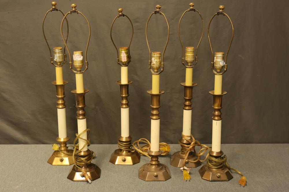 Mohonk Mountain House Brass Single Candlestick Table Lamps, Quantity of 6. Set of six brass table lamps designed in a single candlestick style. Featuring brass components with white accents and each equipped with wiring and sockets. Some lamps show wear consistent with prior use. Pickup only.