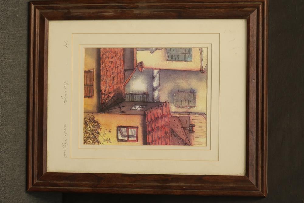 12 artwork pieces by different artists in varied mediums, including a framed print of "Acrobat" by Man Ray, watercolors such as "Frances P. Mesquita 1905" by Allen Hawkes and "Thistles" by Jane McConnaughey Boling, and "Double Waterfall," an oil on board signed as Lipman. Pieces range in size from approximately 36.25 inches long x 24.25 inches wide to approximately 14.5 inches long x 12.5 inches wide. Pickup only.