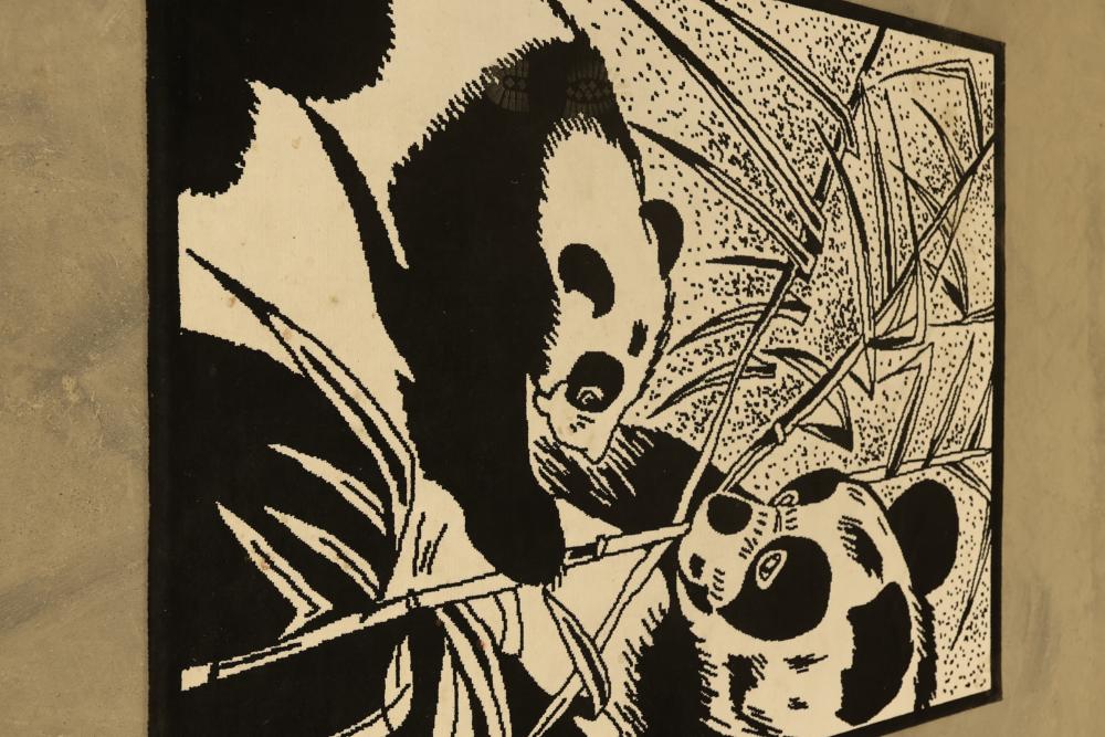 Black and White Panda-Themed Area Rug, Machine Made. Measures approximately 88 inches long and 66 inches wide. Features a detailed panda design. Note some staining on the bottom third of the rug, see photos for details. Pickup only.