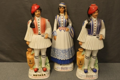 Three vintage Metaxa Ouzo ceramic decanters with Greek figural designs. Contents must be poured out prior to removal. Pickup only.