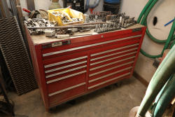 Matco rolling tool chest with multiple drawers, assorted sockets, socket trays, wrenches, pry bars, pliers, screwdrivers, hex keys, and miscellaneous hand tools; approximately 53 inches wide, 24 inches deep, and 40 inches tall.