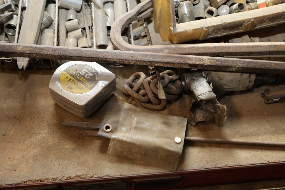 Matco rolling tool chest with multiple drawers, assorted sockets, socket trays, wrenches, pry bars, pliers, screwdrivers, hex keys, and miscellaneous hand tools; approximately 53 inches wide, 24 inches deep, and 40 inches tall.