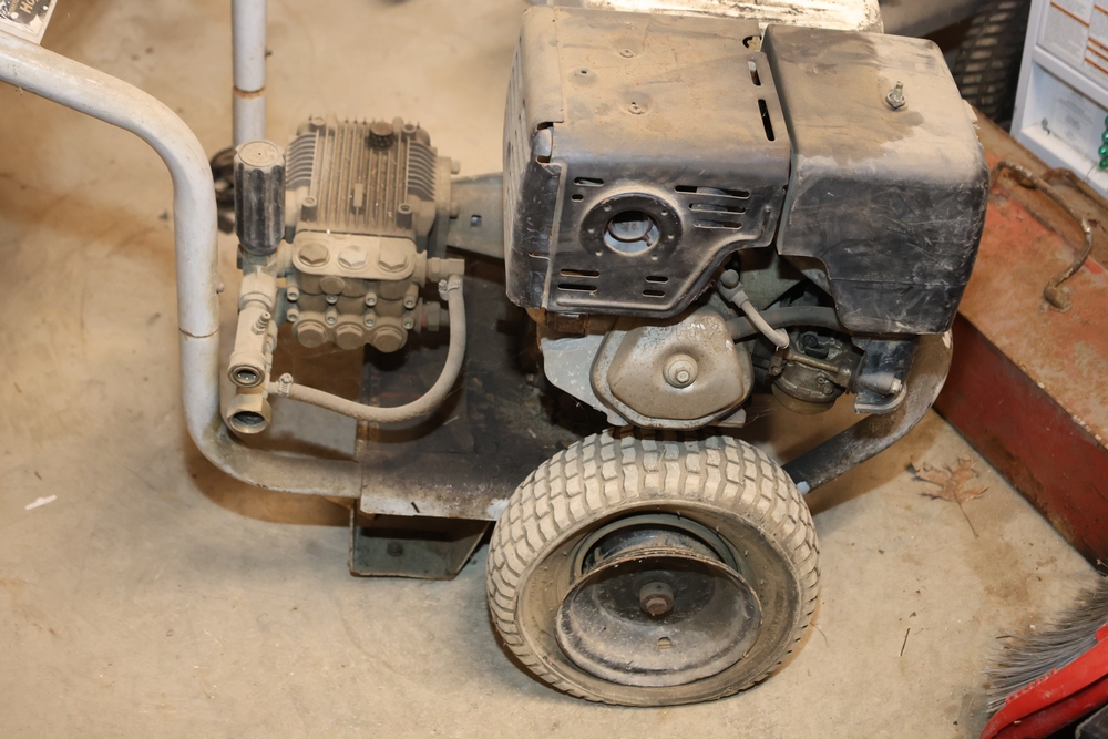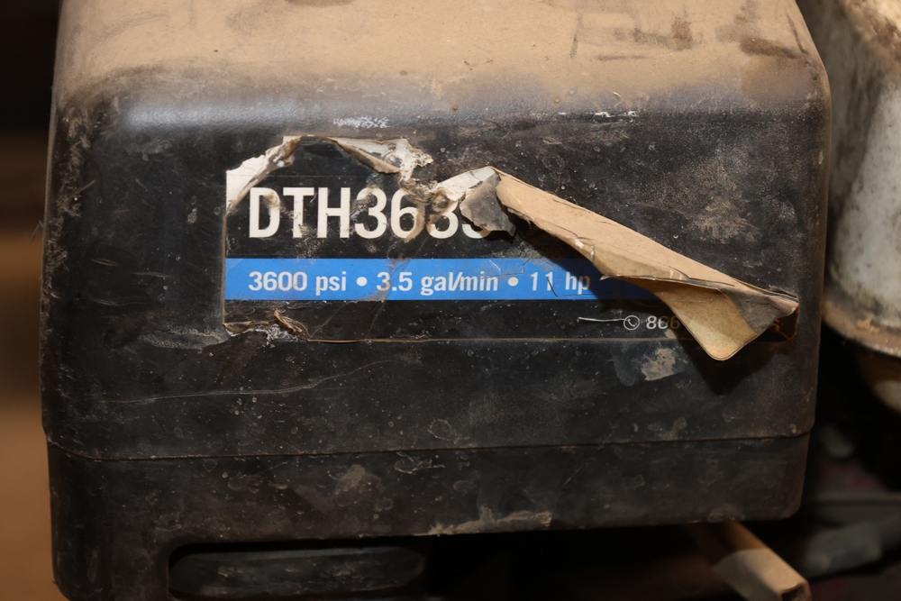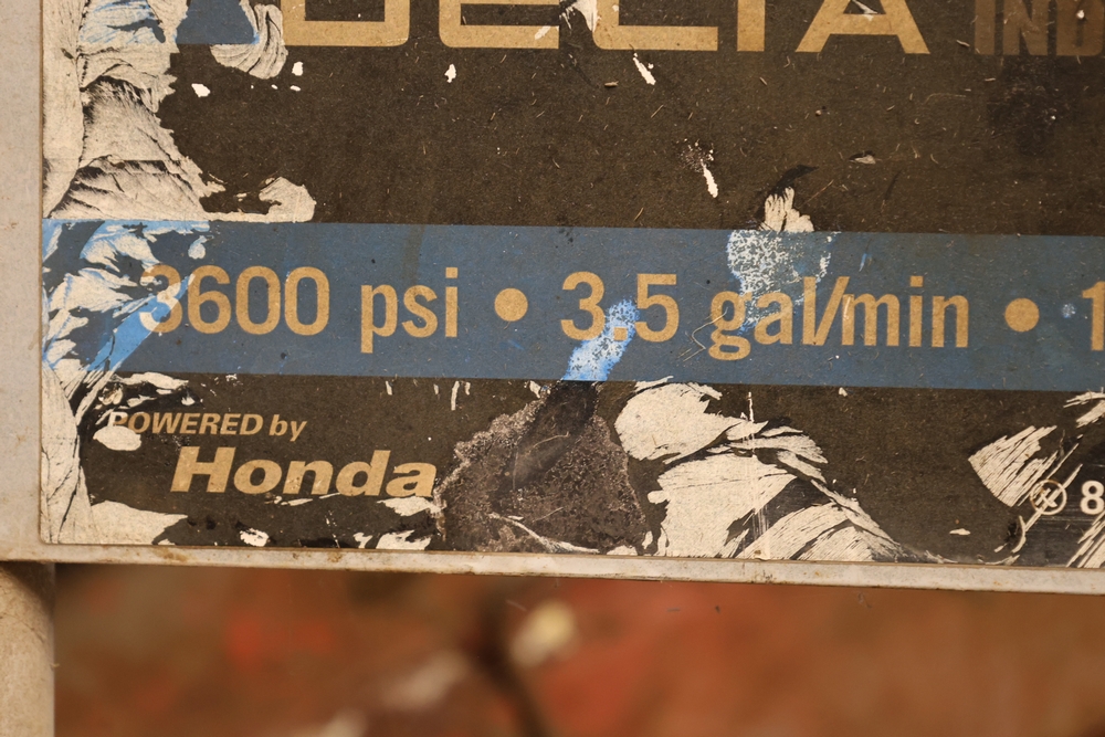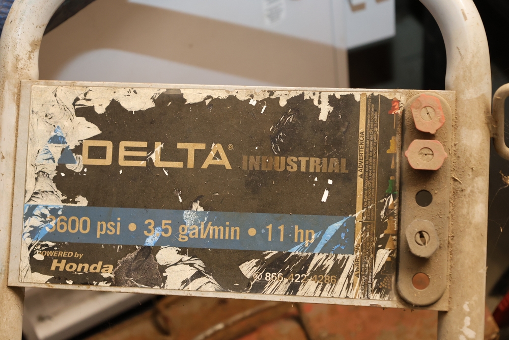 Delta industrial pressure washer model DTH3635 powered by Honda GX 11.0 engine, rated 3600 psi and 3.5 gal per minute, mounted on wheeled frame with handle. Seller reports: Ran when stored, needs TLC.